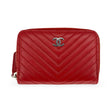This is an authentic Chanel Zip Coin Purse crafted of Chevron Quilted Lambskin leather in Red with silver-tone hardware and matching textile interior. Exterior Features: zip closure. Interior Features: three (3) partitioned compartments.