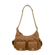This is an authentic Chanel Trendy Pocket Hobo Shoulder Bag crafted of Quilted Calfskin leather in Tan Camel with matching textile interior lining, tonal leather trim and gold-tone hardware. Exterior Features: zip closure, one (1) chain strap with leather shoulder pad and four (4) magnetic closure pockets. Interior Features: open compartment and one (1) flat patch pocket.