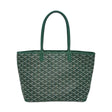 This is an authentic Goyard Artois PM Tote crafted of Goyardine coated canvas in green with Chevroches calfskin leather trim, unlined cotton linen interior and silver-tone hardware. Exterior Features: two (2) top handles. Interior Features: open compartment and one (1) patch pocket.