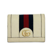 This is an authentic Gucci Ophidia Compact Wallet crafted of grained calfskin leather in white with matching leather trim, green and red Web and gold-tone hardware. Features: snap closure, four (4) card slots, one (1) bill compartment and one (1) zip pocket.