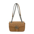 This is an authentic Gucci Marmont Small Flap Chain Shoulder Bag crafted of Aria quilted calfskin leather in beige with tan microfiber interior lining and brushed silver-tone hardware. Exterior Features: flap top, push lock closure, sliding chain with leather shoulder pad and double GG hardware at front center buckle. Interior Features: open compartment and one (1) zip pocket.