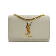 This is an authentic Saint Laurent Small Kate chain bag crafted of Grain de Poudre embossed leather in Blanc Vintage with black grosgrain fabric interior lining and gold-tone hardware. Exterior Features: magnetic snap tab closure and sliding chain shoulder strap. Interior Features: open compartment and one (1) flat pocket.