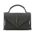 This is an authentic Saint Laurent Medium College Chain Bag crafted of Quilted Calfskin leather in Grey with matching leather trim, black grosgrain fabric interior lining and silver-tone hardware. Exterior Features: magnetic snap closure, one (1) top handle and optional chain strap with leather shoulder pad. Interior Features: open compartments with one (1) zip pocket.