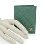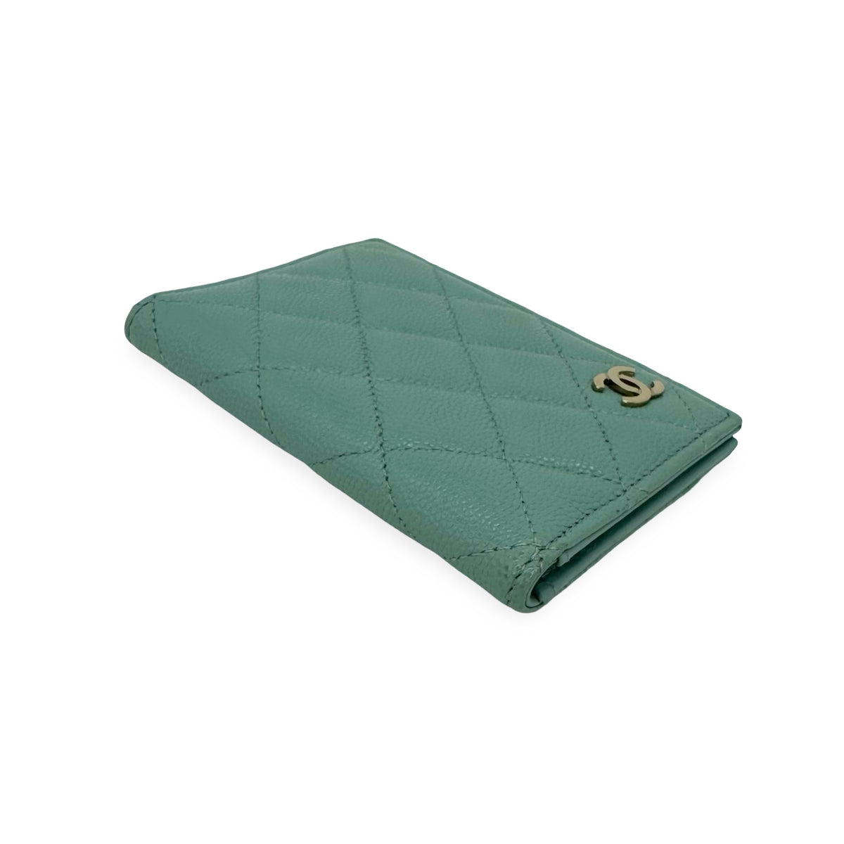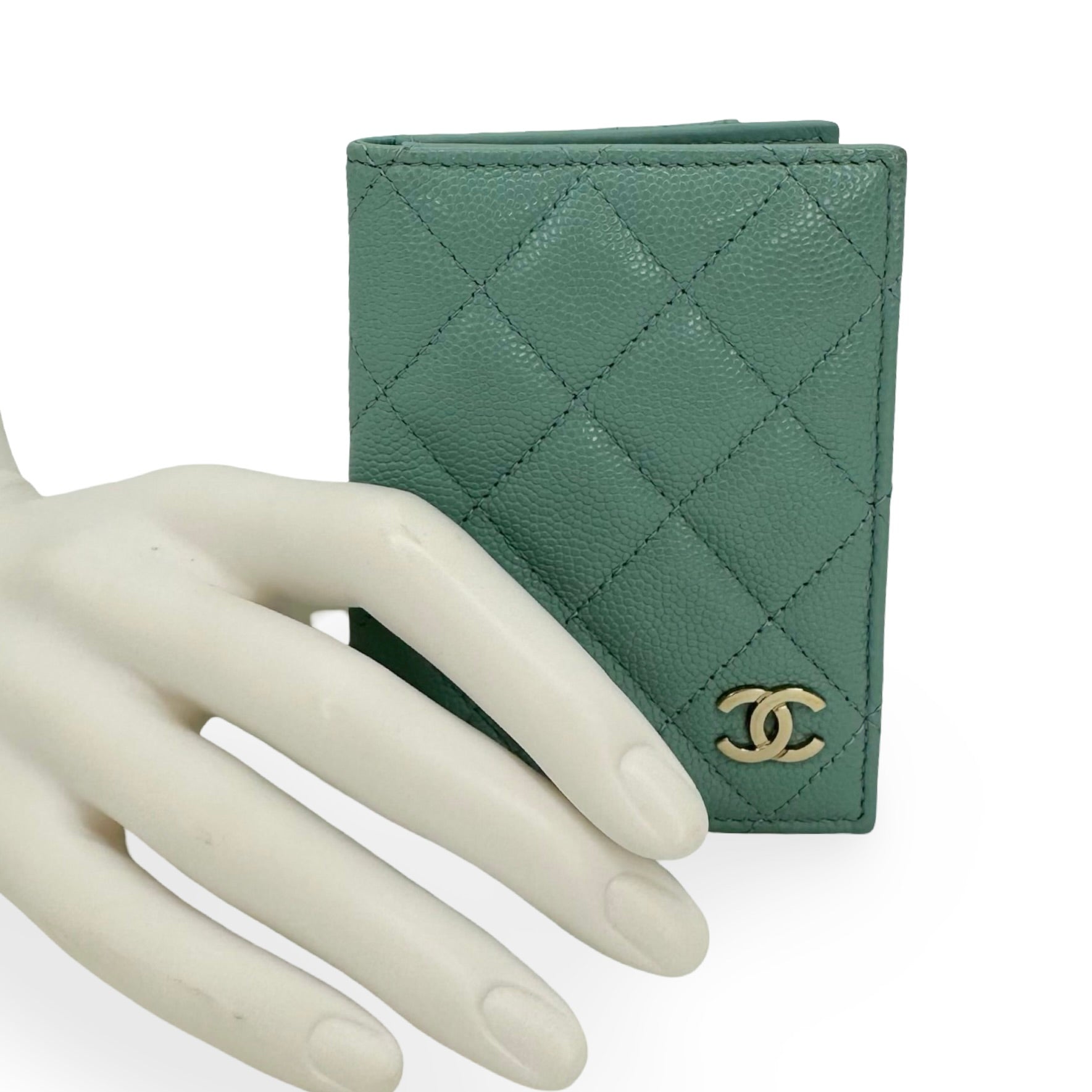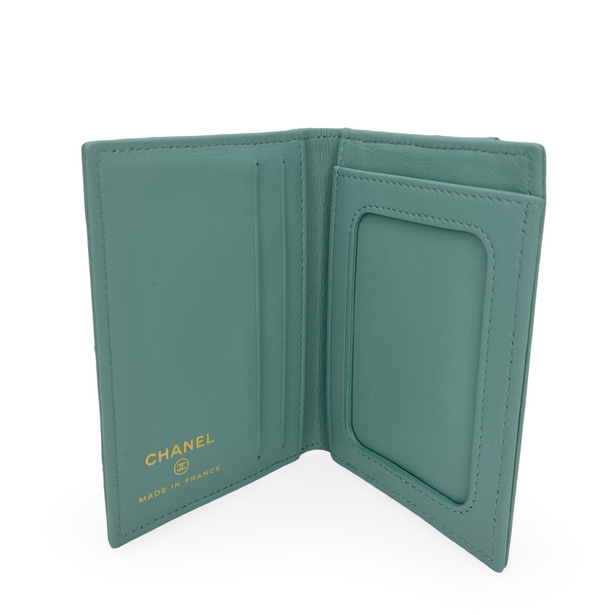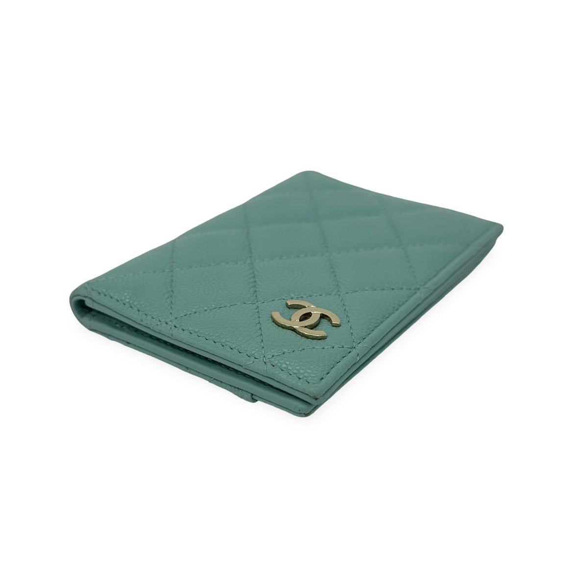 Unit price / perThis is an authentic Chanel CC Vertical Bifold Card Holder Wallet crafted of Quilted Caviar leather in Light Blue Green with matching leather interior and silver-tone hardware. Exterior Features: one (1) card slot at reverse. Interior features: two (2) card slots, one (1) flat pocket and one (1) ID slot.