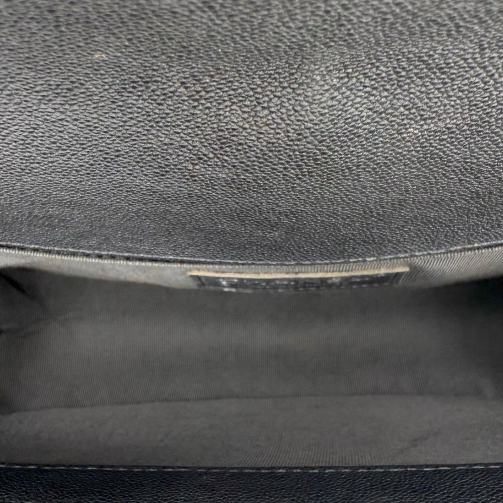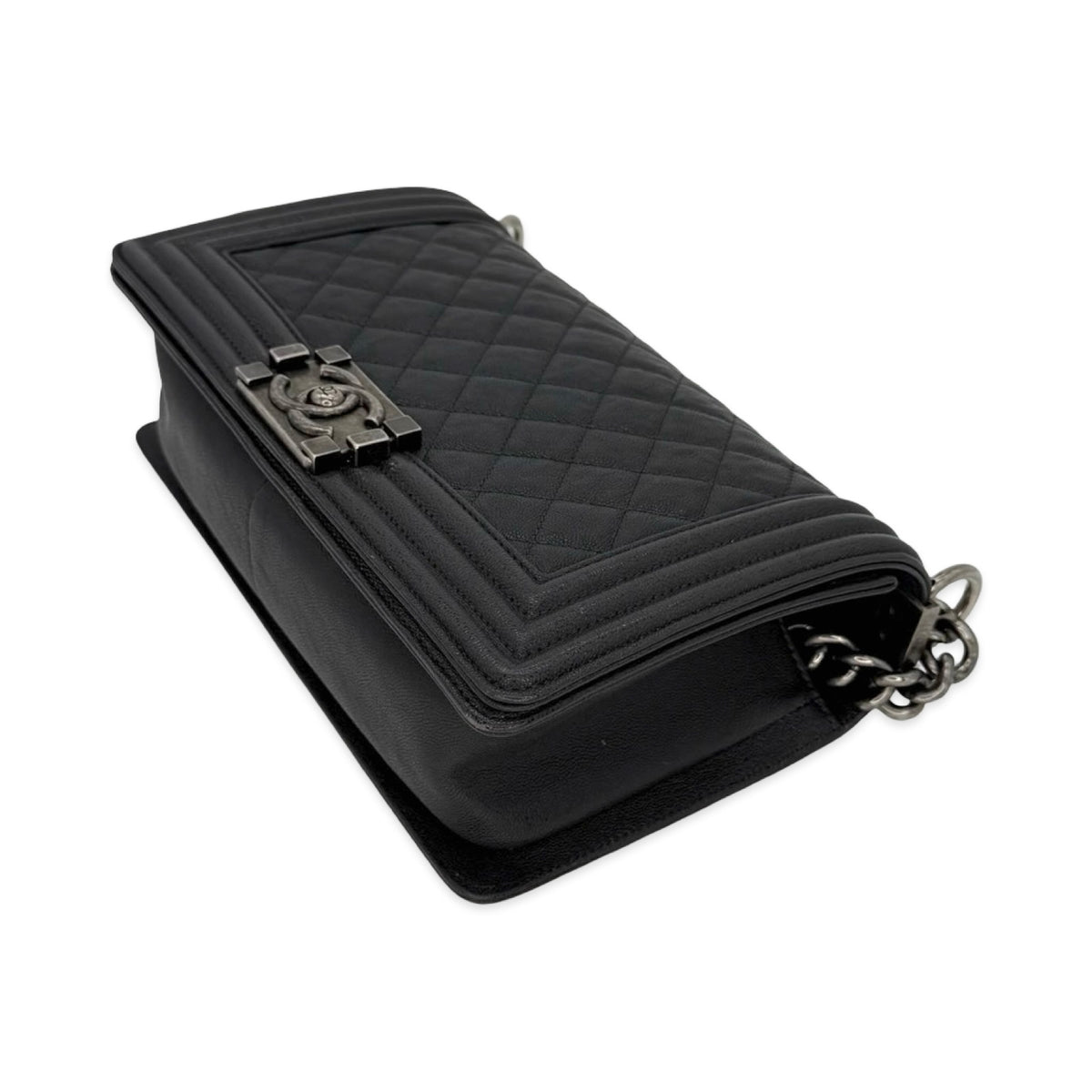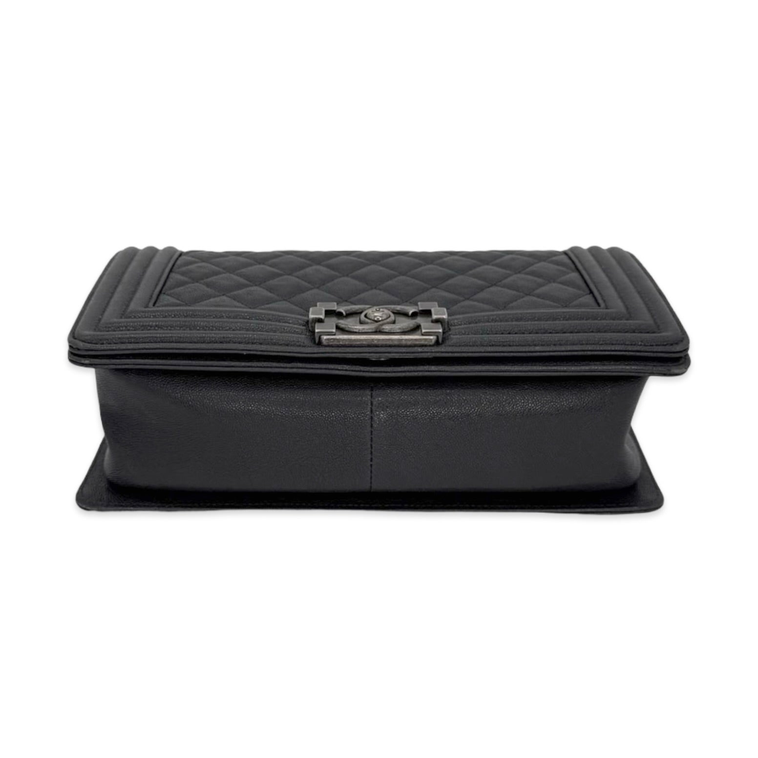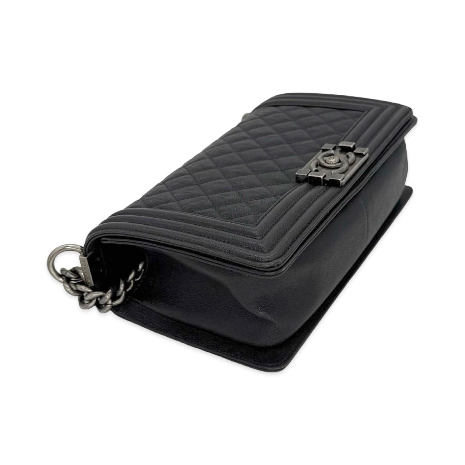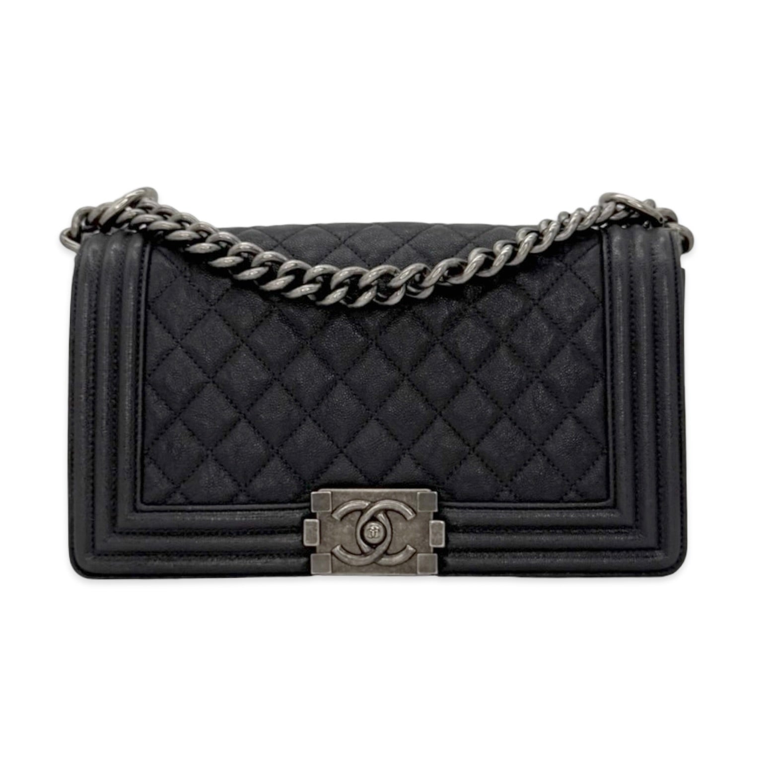 Unit price / perThis is an authentic Chanel Old Medium Boy bag crafted of Quilted Caviar leather in dark grey with antique silver-tone hardware, matching textile interior lining and matching leather trim. Exterior Features: fold over flap, sliding chain with leather shoulder pad and CC plaque push lock closure. Interior Features: one (1) patch pocket and open compartment.
