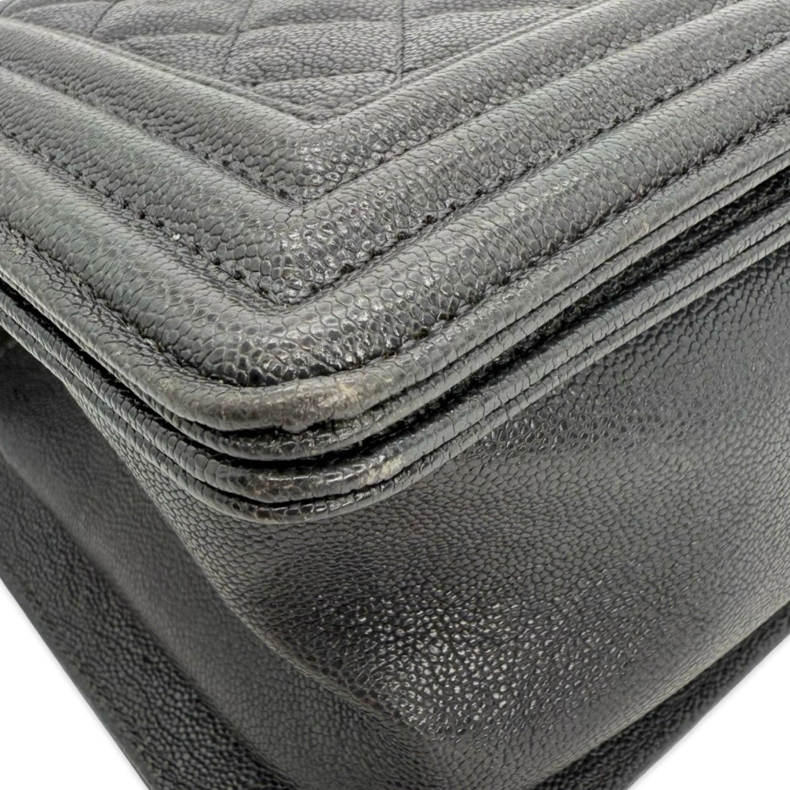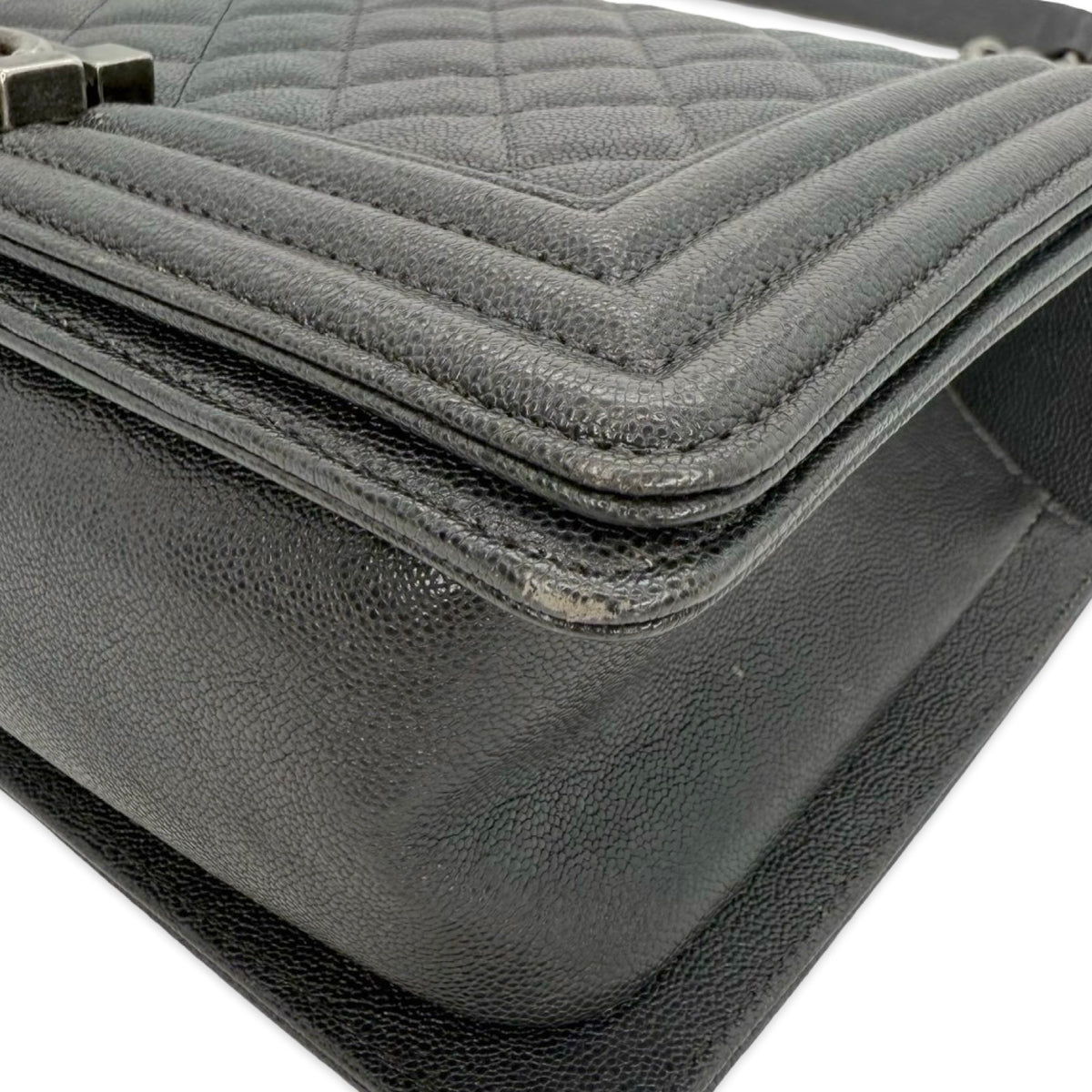 This is an authentic Chanel Old Medium Boy bag crafted of Quilted Caviar leather in dark grey with antique silver-tone hardware, matching textile interior lining and matching leather trim. Exterior Features: fold over flap, sliding chain with leather shoulder pad and CC plaque push lock closure. Interior Features: one (1) patch pocket and open compartment.