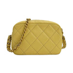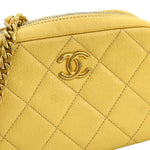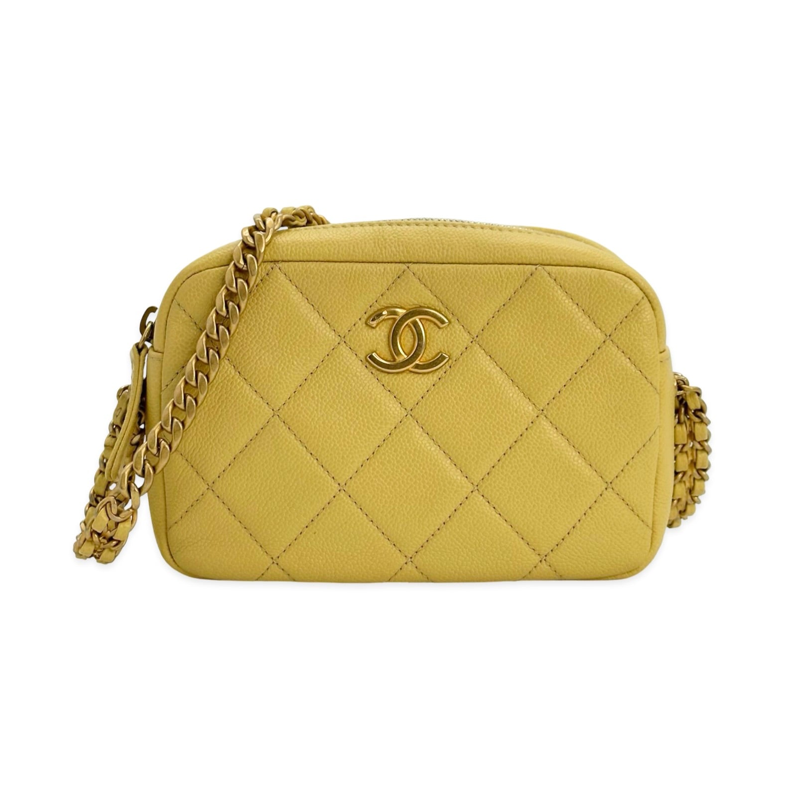 This is an authentic Chanel Melody Small Camera Crossbody Bag crafted of Quilted Caviar leather in Yellow with matching leather trim, tonal textile interior lining and gold-tone hardware. Exterior Features: zip top closure and braided leather chain strap. Interior Features: one (1) patch pocket.