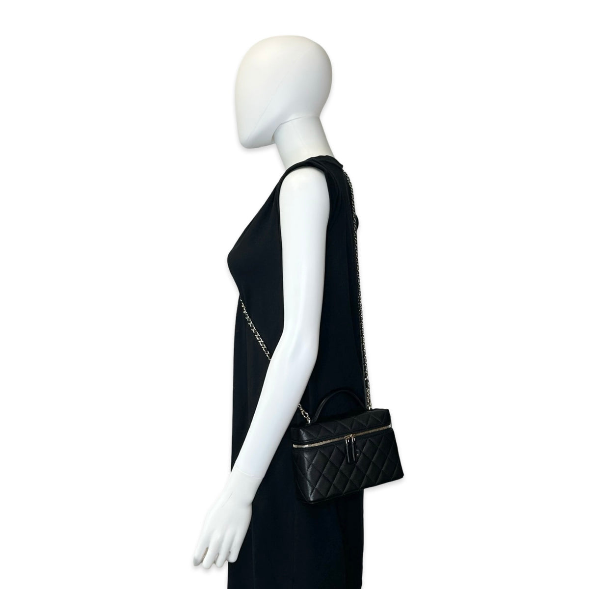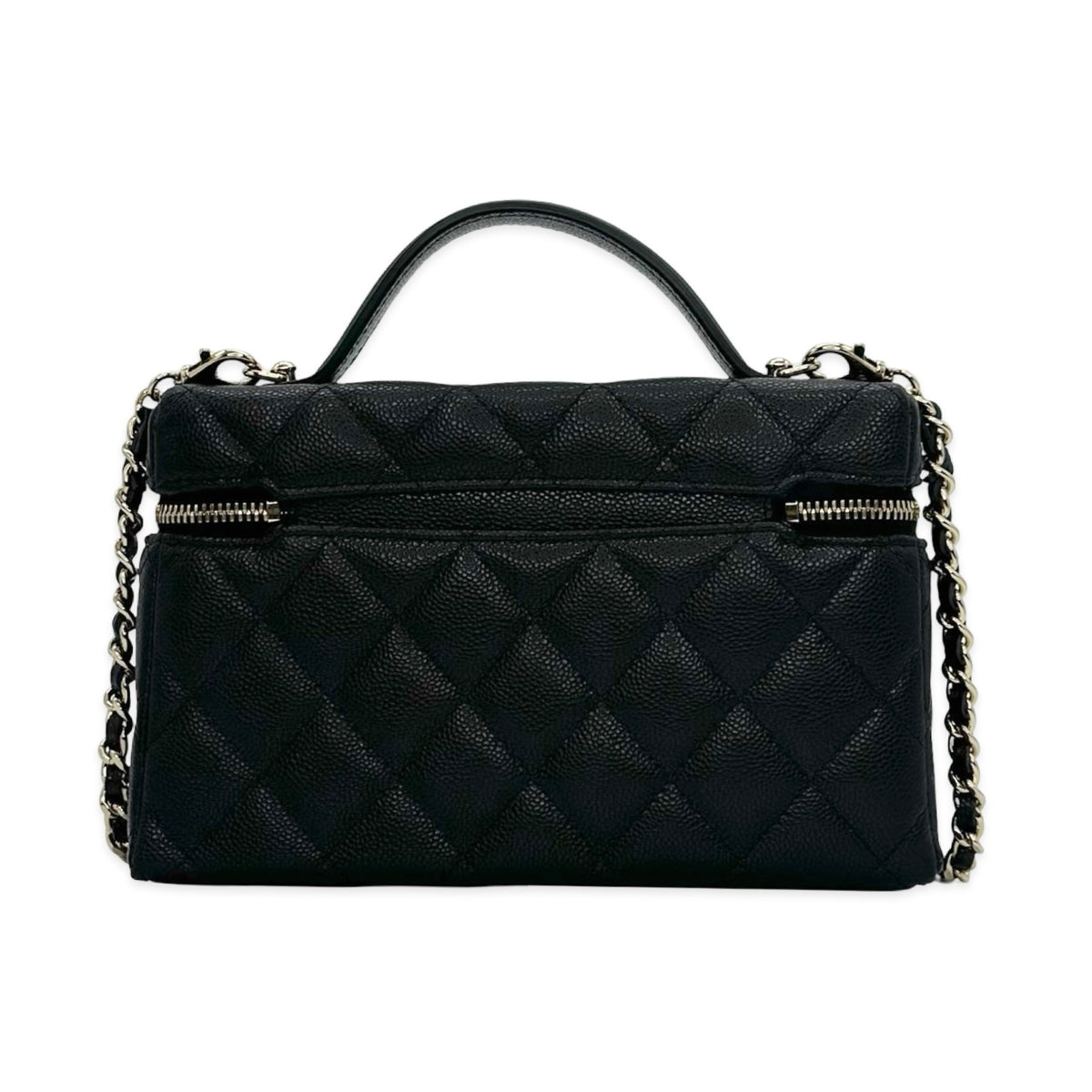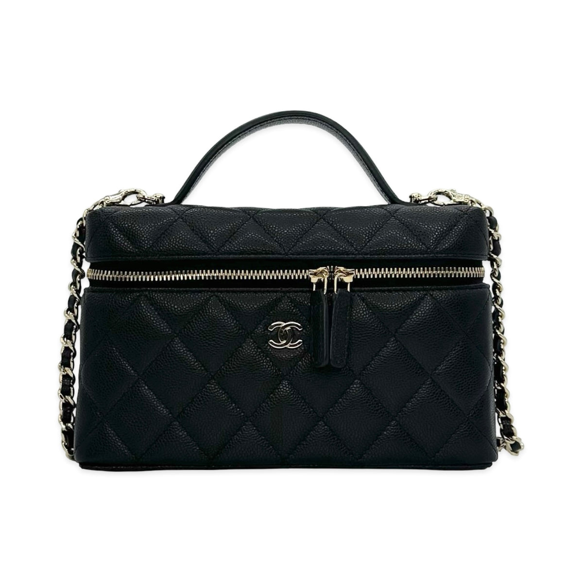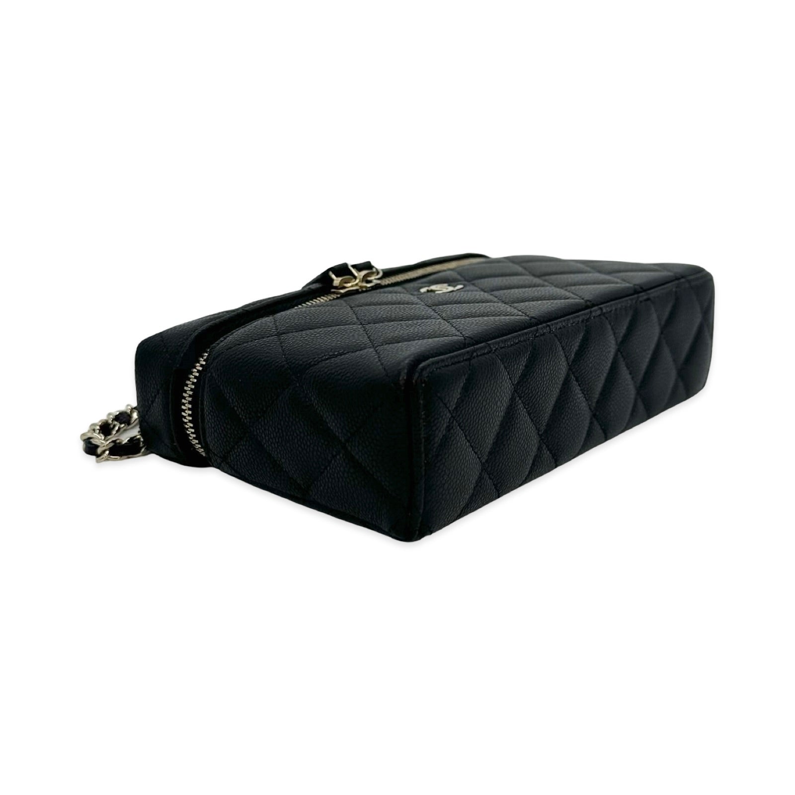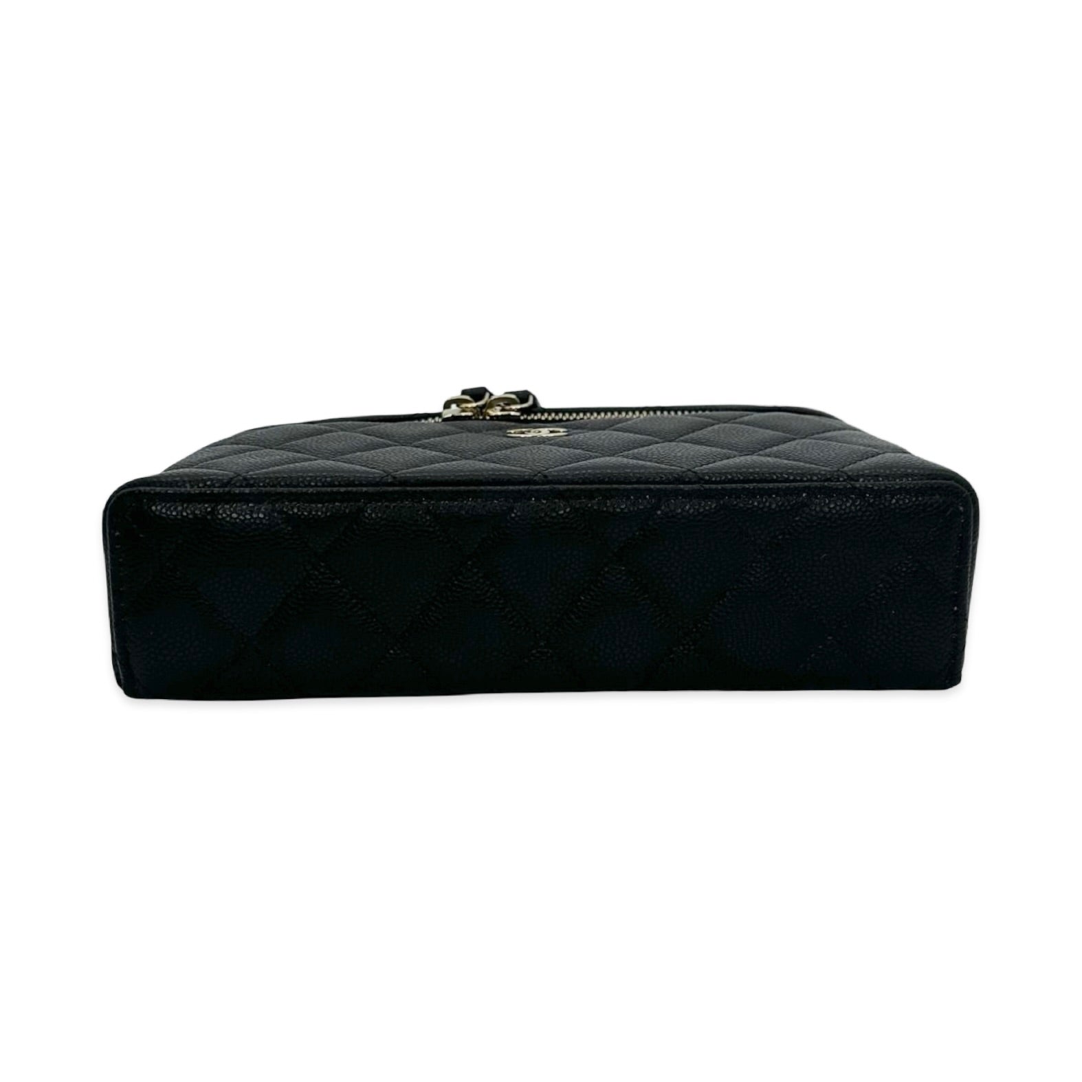 Unit price / perThis is an authentic Chanel Slim Vanity Case crafted of Quilted Caviar leather in black with matching leather trim, textile interior lining and gold-tone hardware. Exterior Features: double zip closure, one (1) top handle and one (1) braided leather chain strap. Interior Features: open compartment and two (2) card slots.