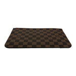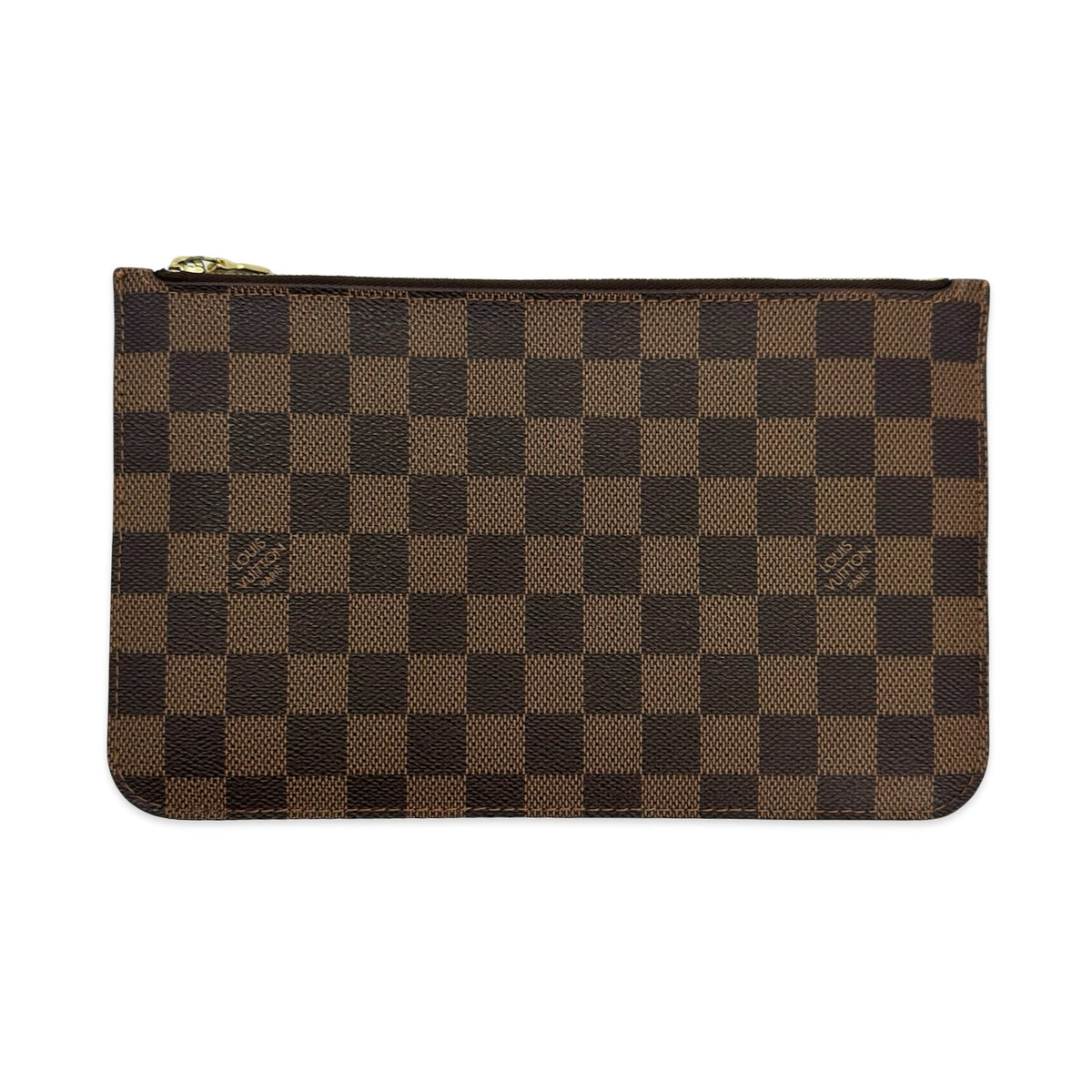 Unit price / perThis is an authentic Louis Vuitton Neverfull Pochette crafted of Damier Ebene coated canvas with brown cowhide leather trim, Cherry Red striped textile lining and gold-tone hardware. Exterior Features: one wristlet strap and zip top closure. Interior Features: open compartment with one (1) flat pocket.
