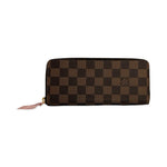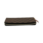 Unit price / perThis is an authentic Louis Vuitton Clemence wallet crafted of Damier Ebene coated canvas with Rose Ballerine leather interior and gold-tone hardware. Exterior Features: zip around closure. Interior Features: eight (8) credit card slots, one (1) zip pocket, two (2) flat pockets and two (2) gusseted compartments.