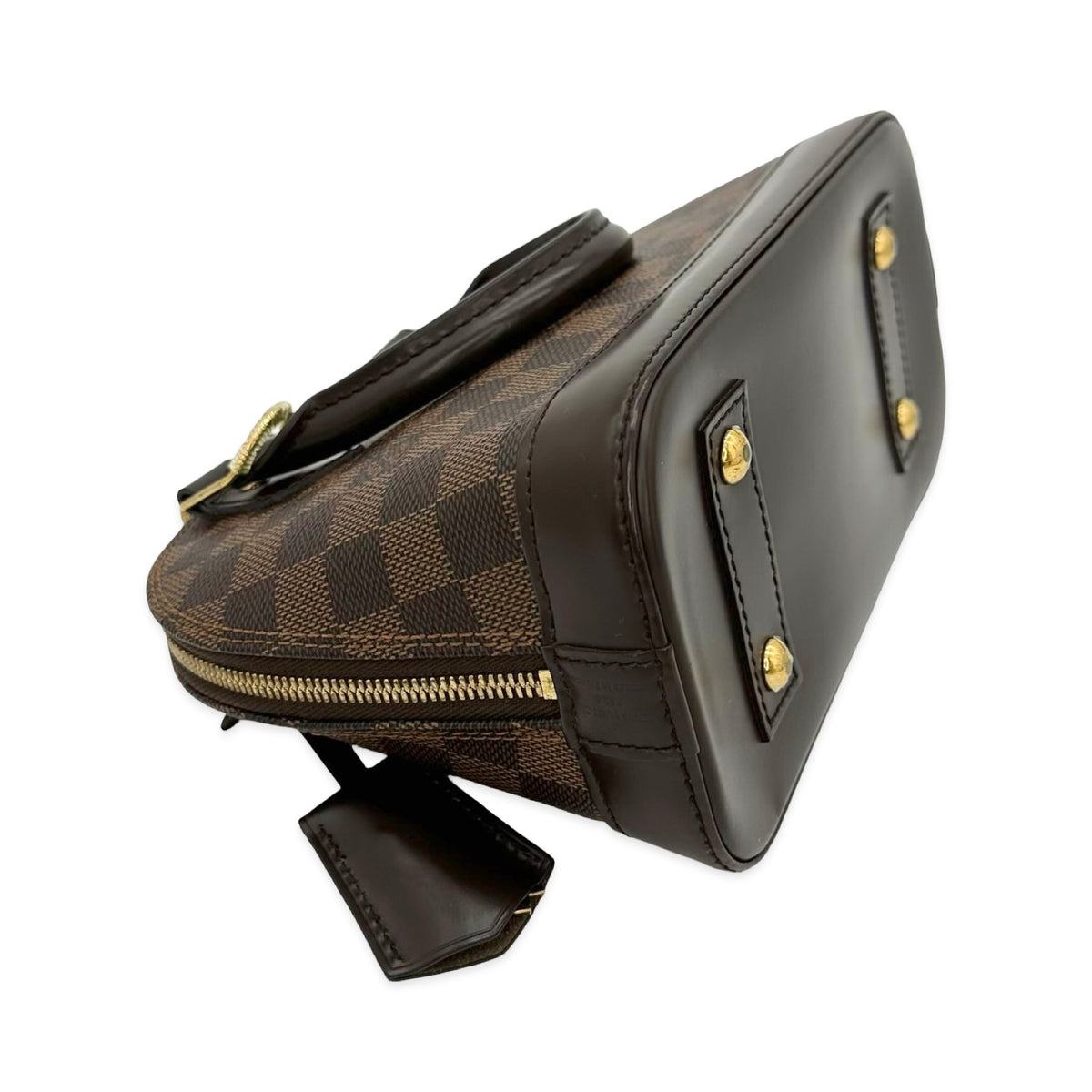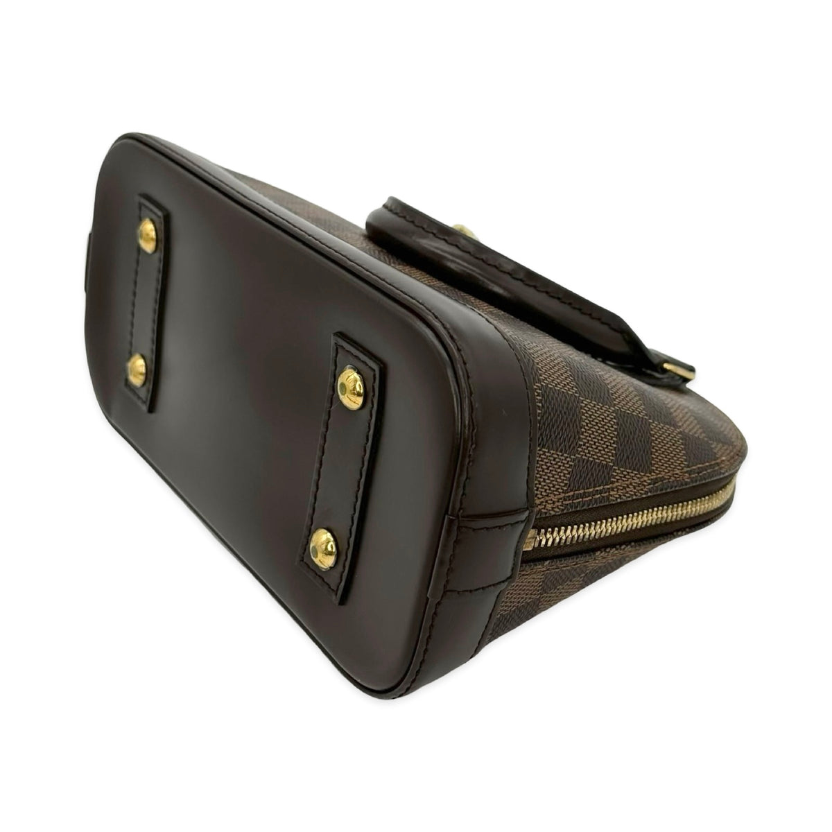 Unit price / perThis is an authentic Louis Vuitton Alma BB crafted of Damier Ebene coated canvas with optional leather crossbody strap, leather top handles, Cherry Red textile interior lining and gold-tone hardware. Exterior Features: double zip closure, padlock & key(s), one (1) clochette tag, two (2) top handles, one (1) optional non-adjustable leather strap and four (4) protective bottom studs. Interior Features: open compartment and one (1) flat pocket.