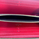 Unit price / perThis is an authentic Louis Vuitton Clemence wallet crafted of Damier Ebene coated canvas with Cherry Red leather interior and gold-tone hardware. Exterior Features: zip around closure. Interior Features: eight (8) credit card slots, one (1) zip pocket, two (2) flat pockets and two (2) gusseted compartments.
