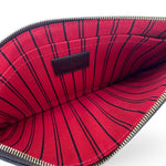This is an authentic Louis Vuitton Neverfull Pochette crafted of Damier Ebene coated canvas with brown cowhide leather trim, Cherry Red striped textile lining and gold-tone hardware. Exterior Features: one wristlet strap and zip top closure. Interior Features: open compartment with one (1) flat pocket.