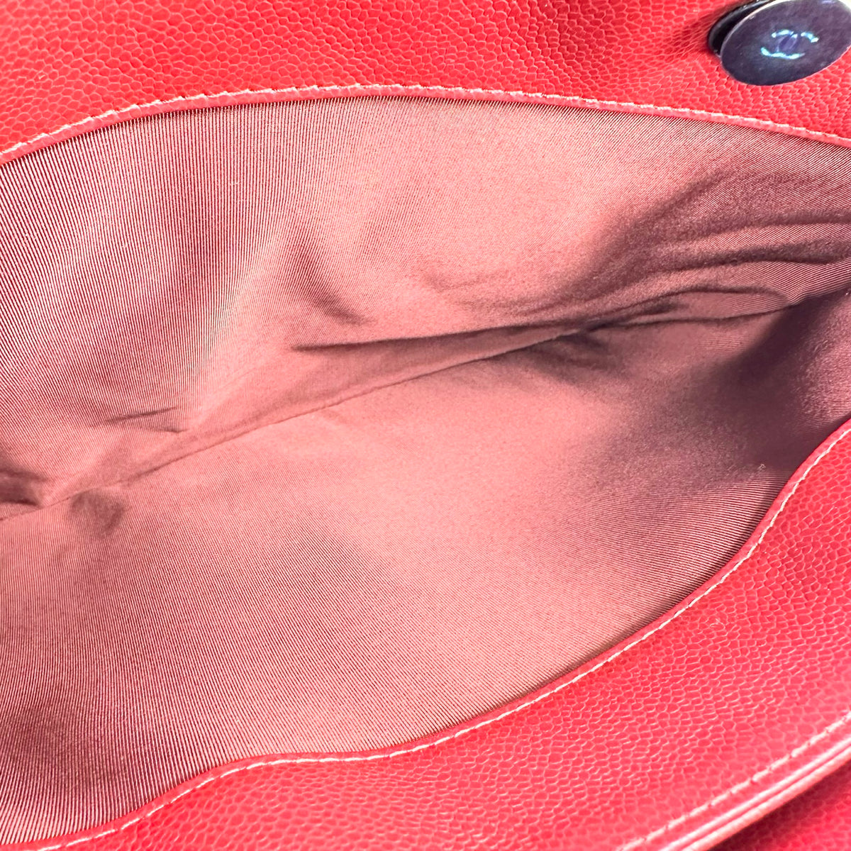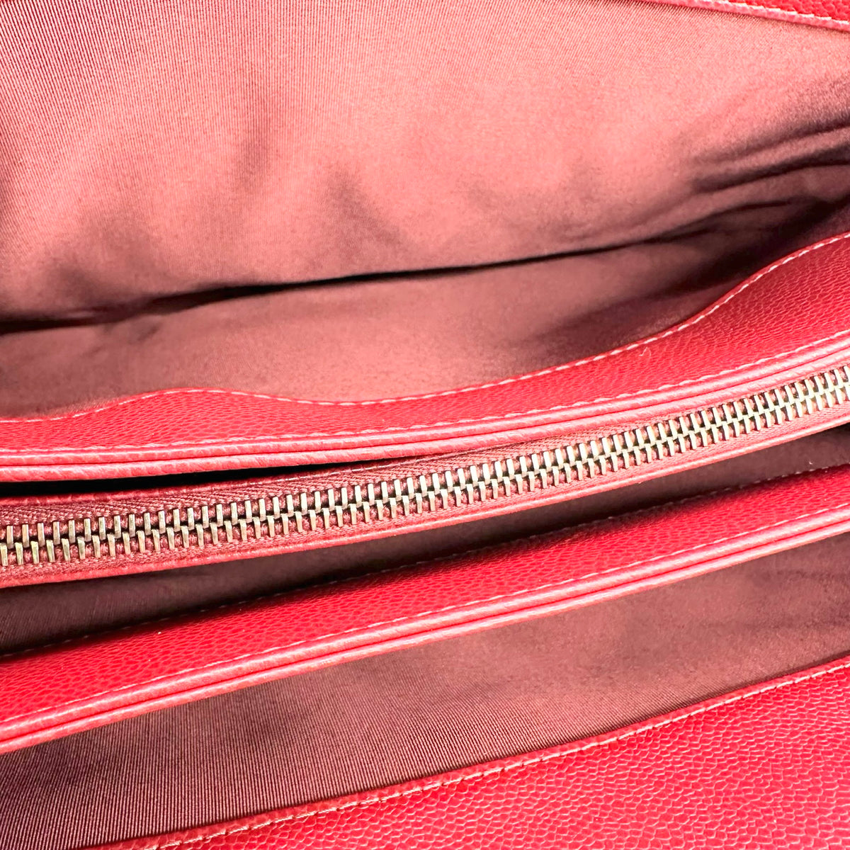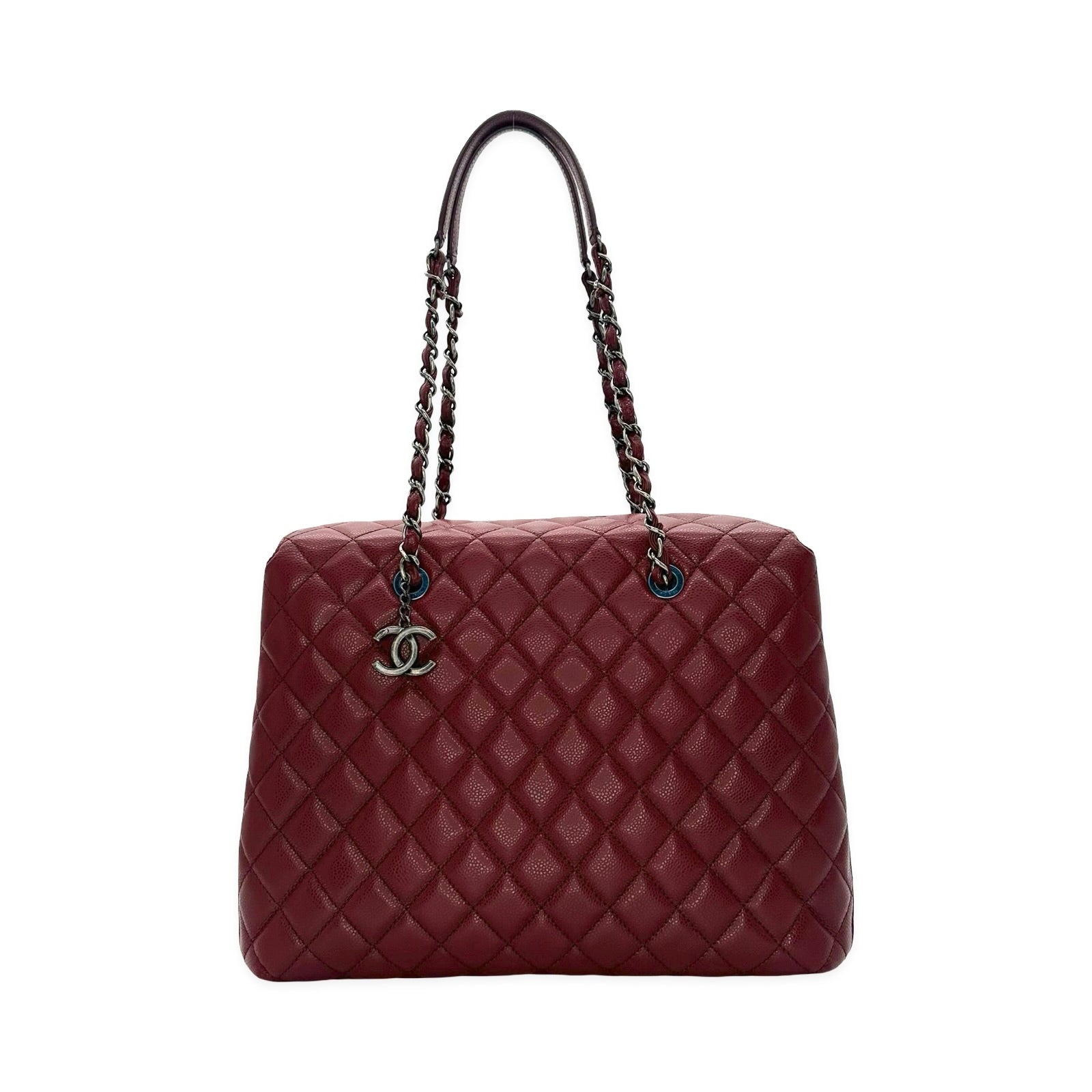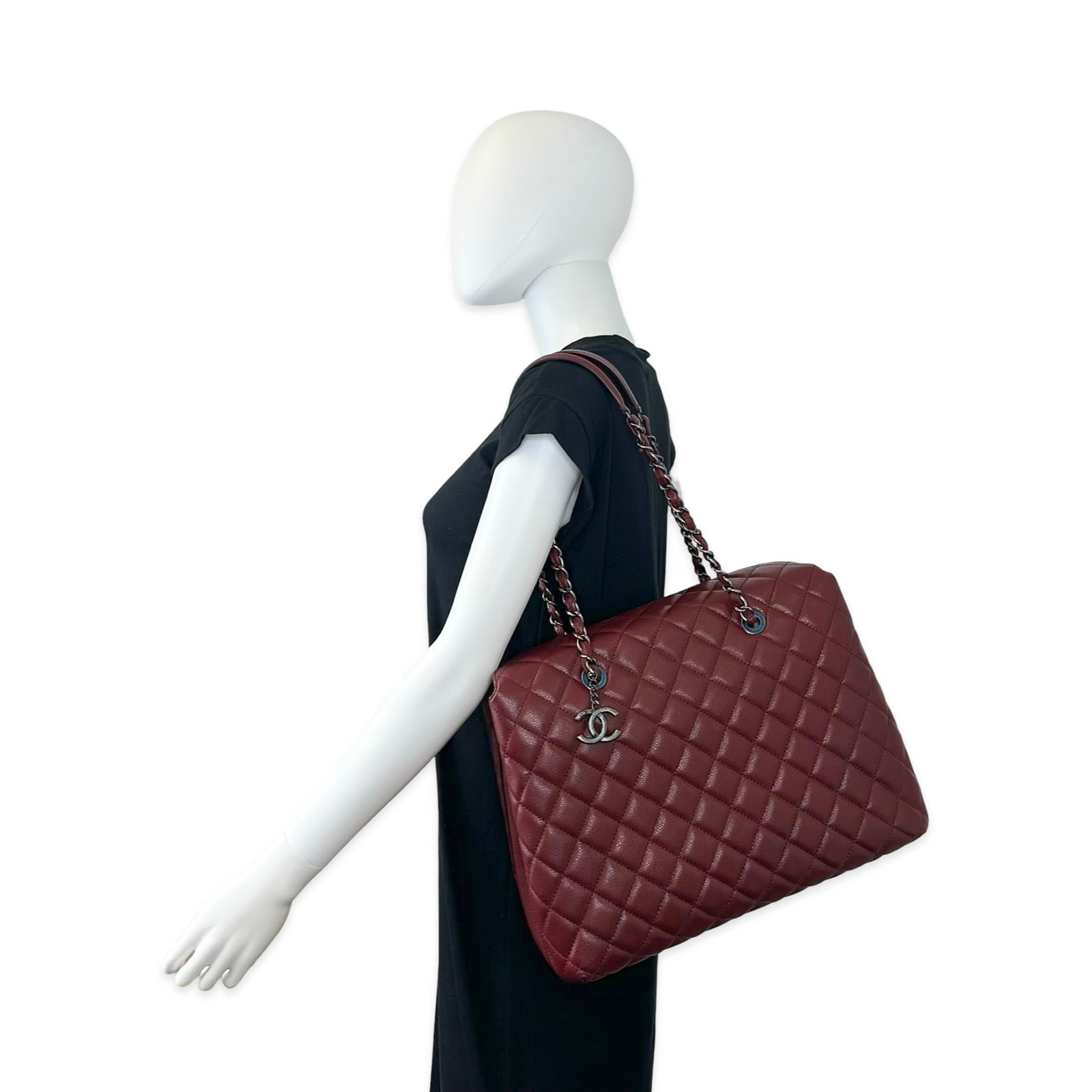 Unit price / perThis is an authentic Chanel City Shopper Tote crafted of Quilted Caviar leather in Maroon Red with matching leather trim, tonal nylon interior lining and silver-tone hardware. Exterior Features: flap top closure, one (1) back patch pocket, two (2) braided leather chain straps with shoulder pad, CC charm and four (4) protective leg studs. Interior Features: four (4) partitioned compartments, one (1) center zip pocket, one (1) flat zip pocket and one (1) interior clasp hook.
