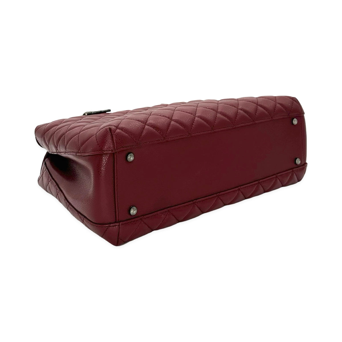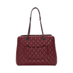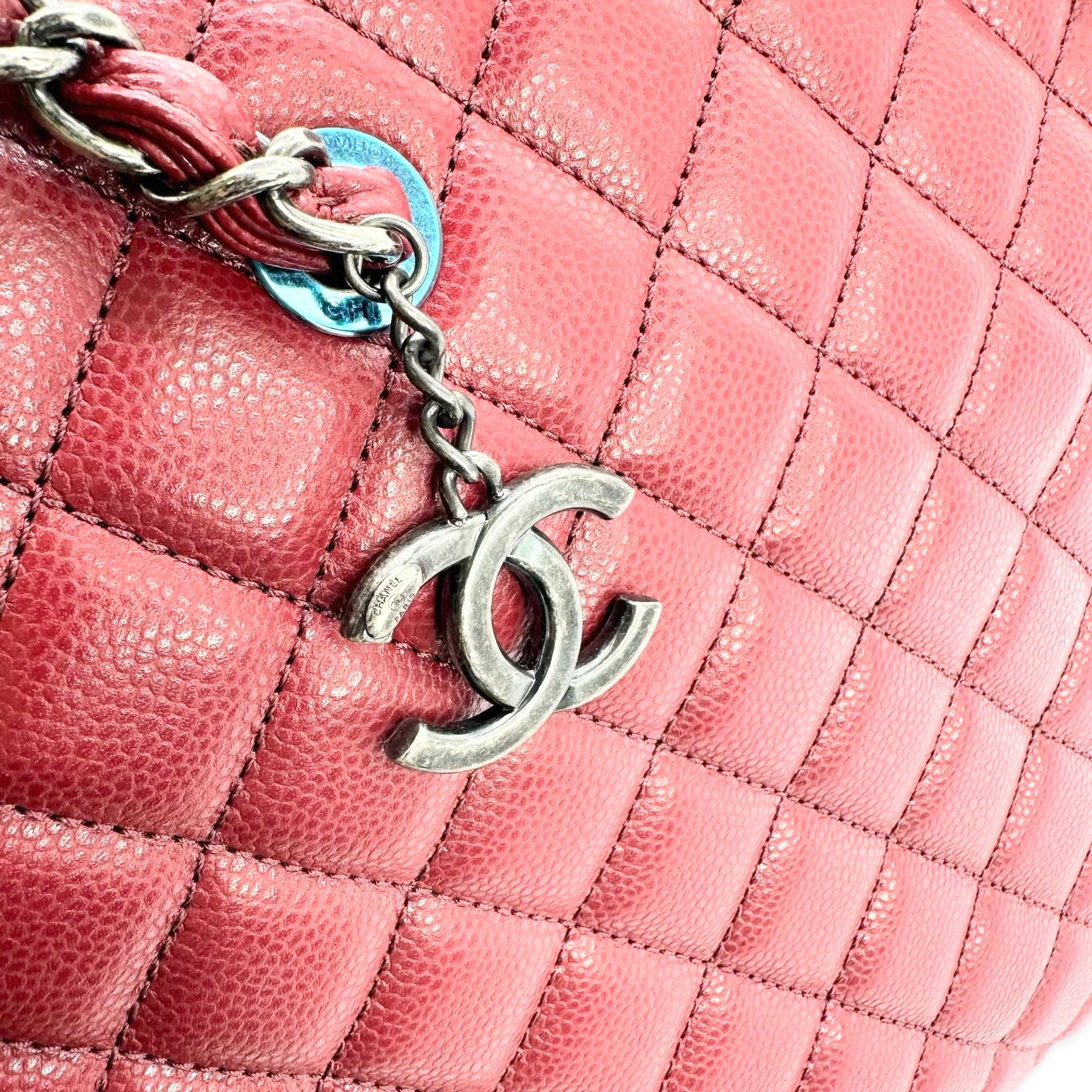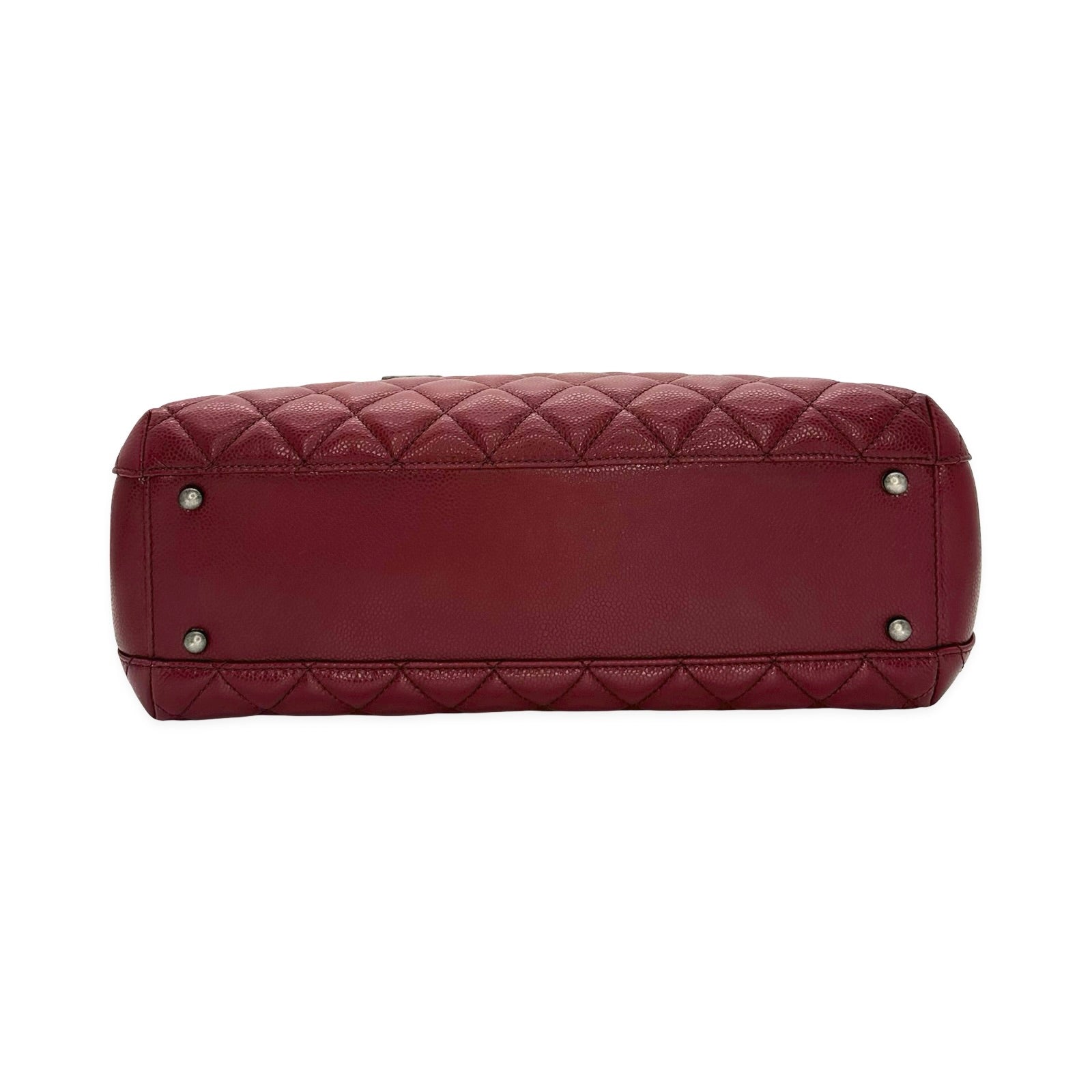 This is an authentic Chanel City Shopper Tote crafted of Quilted Caviar leather in Maroon Red with matching leather trim, tonal nylon interior lining and silver-tone hardware. Exterior Features: flap top closure, one (1) back patch pocket, two (2) braided leather chain straps with shoulder pad, CC charm and four (4) protective leg studs. Interior Features: four (4) partitioned compartments, one (1) center zip pocket, one (1) flat zip pocket and one (1) interior clasp hook.