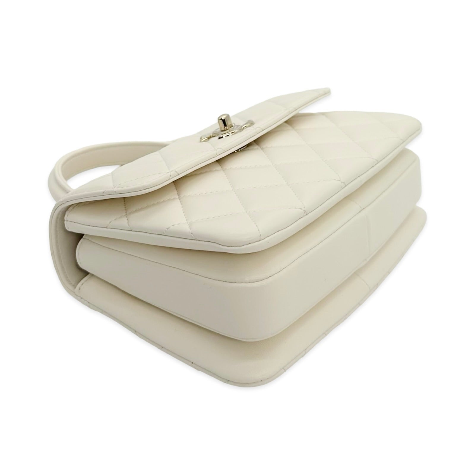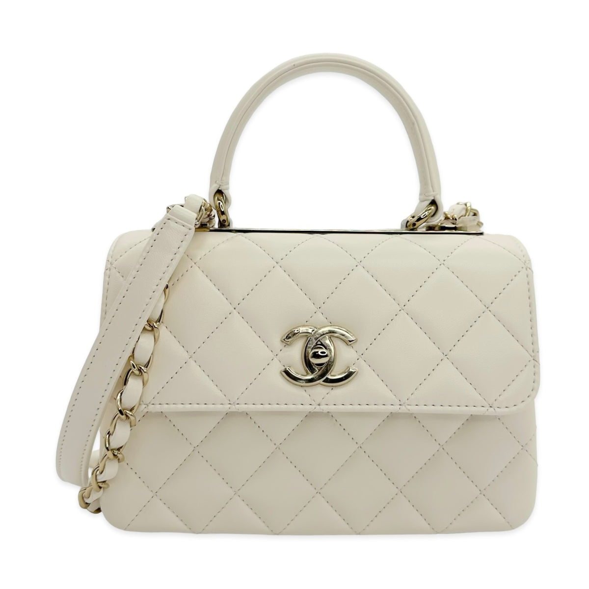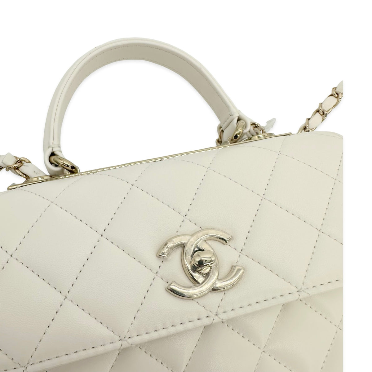 Unit price / perThis is an authentic Chanel Mini Trendy Top Handle bag crafted of Quilted Lambskin leather in White with matching leather trim, white leather interior and champagne gold-tone hardware. Exterior Features: flap top with CC turn lock closure, one (1) top handle, one (1) back patch pocket, one (1) braided leather chain with shoulder strap and a Chanel plate detail on top. Interior Features: three (3) open compartments, one (1) zip pocket and one (1) flat pocket.