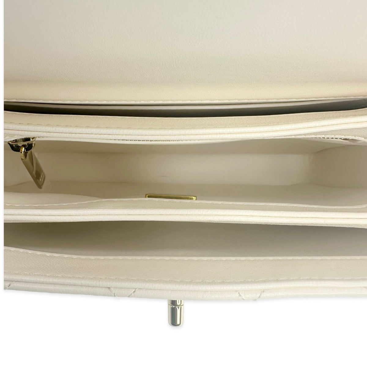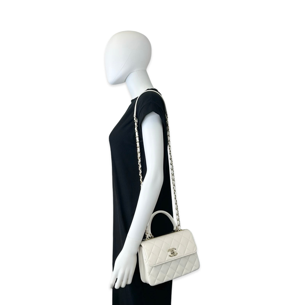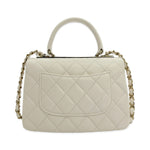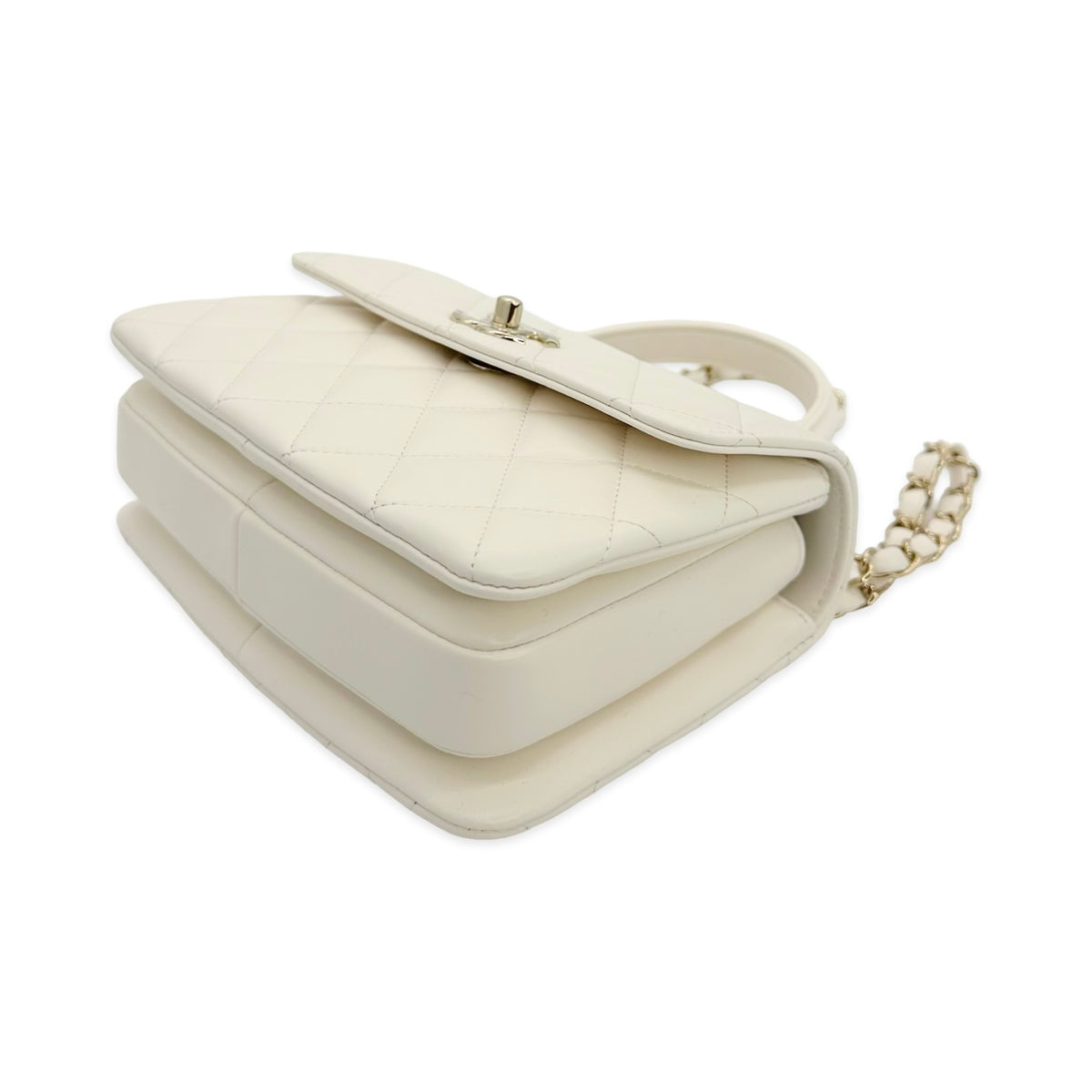 Unit price / perThis is an authentic Chanel Mini Trendy Top Handle bag crafted of Quilted Lambskin leather in White with matching leather trim, white leather interior and champagne gold-tone hardware. Exterior Features: flap top with CC turn lock closure, one (1) top handle, one (1) back patch pocket, one (1) braided leather chain with shoulder strap and a Chanel plate detail on top. Interior Features: three (3) open compartments, one (1) zip pocket and one (1) flat pocket.