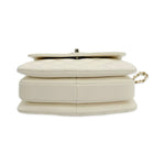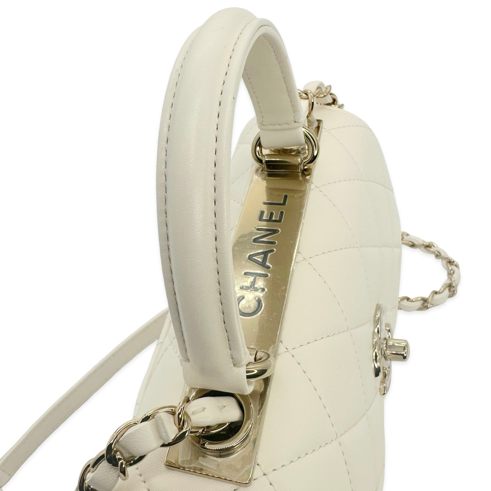This is an authentic Chanel Mini Trendy Top Handle bag crafted of Quilted Lambskin leather in White with matching leather trim, white leather interior and champagne gold-tone hardware. Exterior Features: flap top with CC turn lock closure, one (1) top handle, one (1) back patch pocket, one (1) braided leather chain with shoulder strap and a Chanel plate detail on top. Interior Features: three (3) open compartments, one (1) zip pocket and one (1) flat pocket.