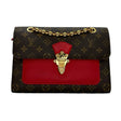 This is an authentic Louis Vuitton Victoire PM crafted of Monogram coated canvas with red grained calfskin leather trim, microfiber interior lining and gold-tone hardware. Exterior Features: front flap with clasp closure, sliding gold tone Bijoux chain strap and one (1) front patch pocket. Interior Features: partitioned compartment and one (1) center zip pocket.