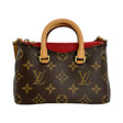This is an authentic Louis Vuitton Nano Pallas crafted of Monogram canvas with red grained leather accents, natural cowhide leather trim, red textile interior lining and gold-tone hardware. Exterior Features: zip closure, one (2) shoulder strap and one (1) patch pocket at front. Interior Features: open compartment.