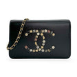 This is an authentic Limited Edition Chanel Classic Wallet on a Chain crafted of smooth Lambskin leather in black with studded charms motif at front, tonal leather trim, contrasting leather interior and gold-tone hardware. Exterior Features: one (1) flat patch pocket at back. Interior Features: one (1) zip compartment, one (1) zip pocket, six (6) card slots and one (1) flat pocket.