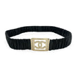 This is an authentic Chanel Ruched CC Belt crafted of lambskin leather in black with champagne gold-tone hardware and elastic waist band.
