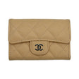 This is an authentic Chanel Classic Flap Card Holder crafted of Quilted Caviar leather in Beige with CC at front and silver-tone hardware. Exterior Features: button snap closure, top flap, one (1) front card pocket and one (1) back card pocket. Interior features: open gusseted compartment.