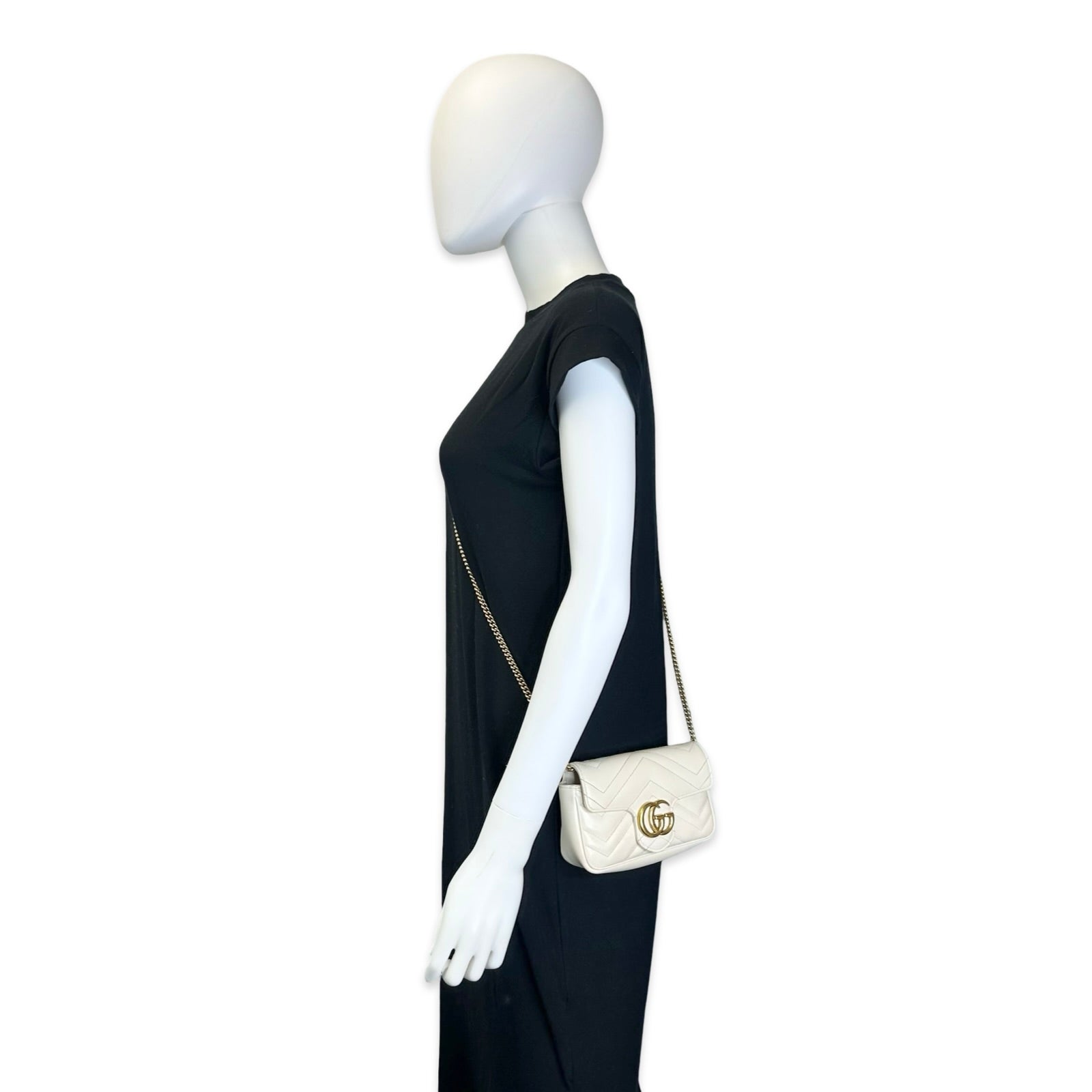 Unit price / perThis is an authentic Gucci Super Mini GG Marmont Chain Bag crafted of Diagonal Quilted calfskin leather in cream with matching leather trim, beige microfiber interior lining and gold-tone hardware. Exterior Features: press-stud closure and optional chain shoulder strap. Interior Features: open compartment with removable key chain hook.