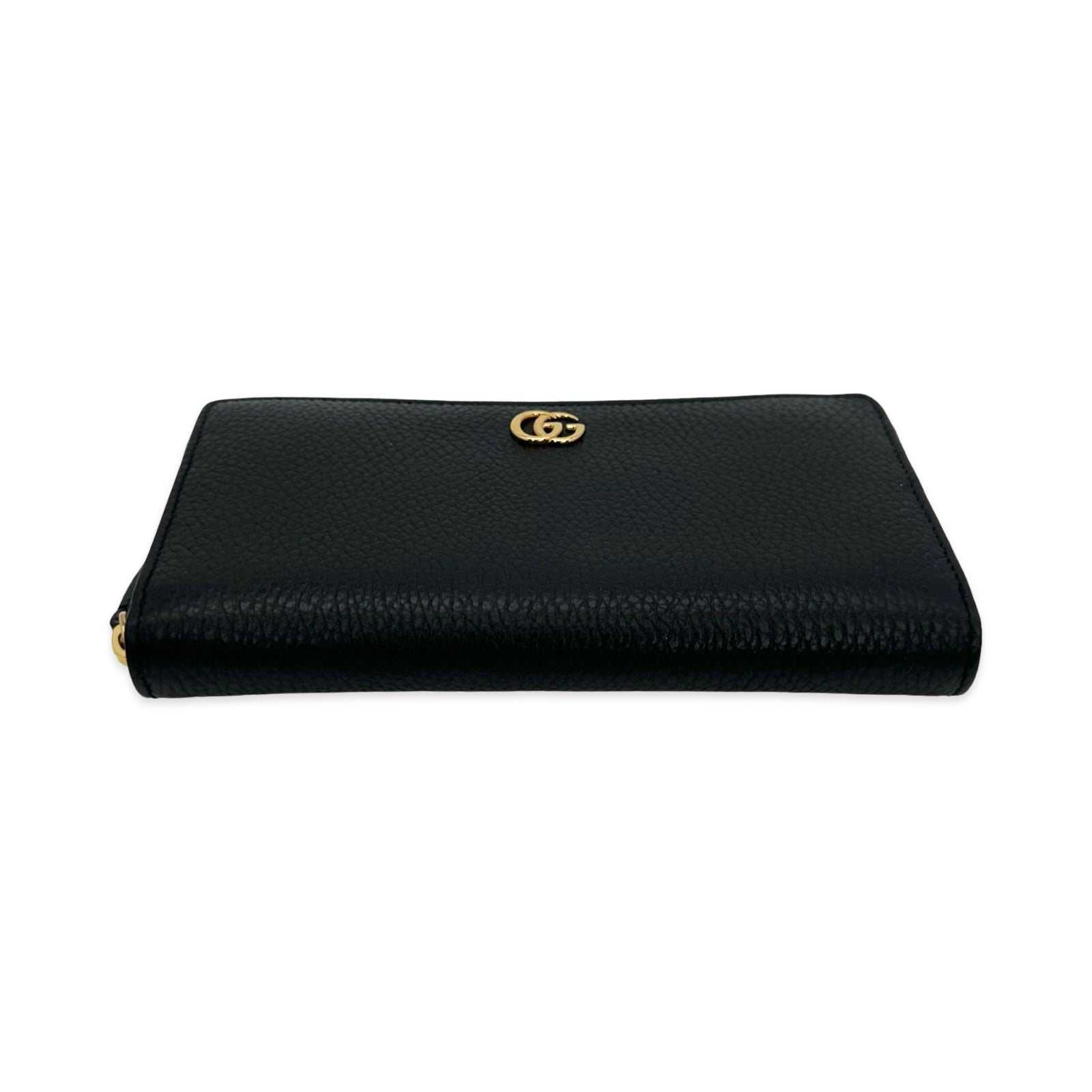 This is an authentic Gucci GG Marmont Zip Around Wallet crafted of Grained Calfskin Leather in black with leather and nylon lining and gold-tone hardware. Exterior Features: zip around closure. Interior Features: twelve (12) card slots, three (3) gusseted compartments and one zip pocket.