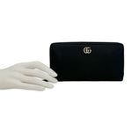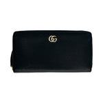 This is an authentic Gucci GG Marmont Zip Around Wallet crafted of Grained Calfskin Leather in black with leather and nylon lining and gold-tone hardware. Exterior Features: zip around closure. Interior Features: twelve (12) card slots, three (3) gusseted compartments and one zip pocket.