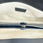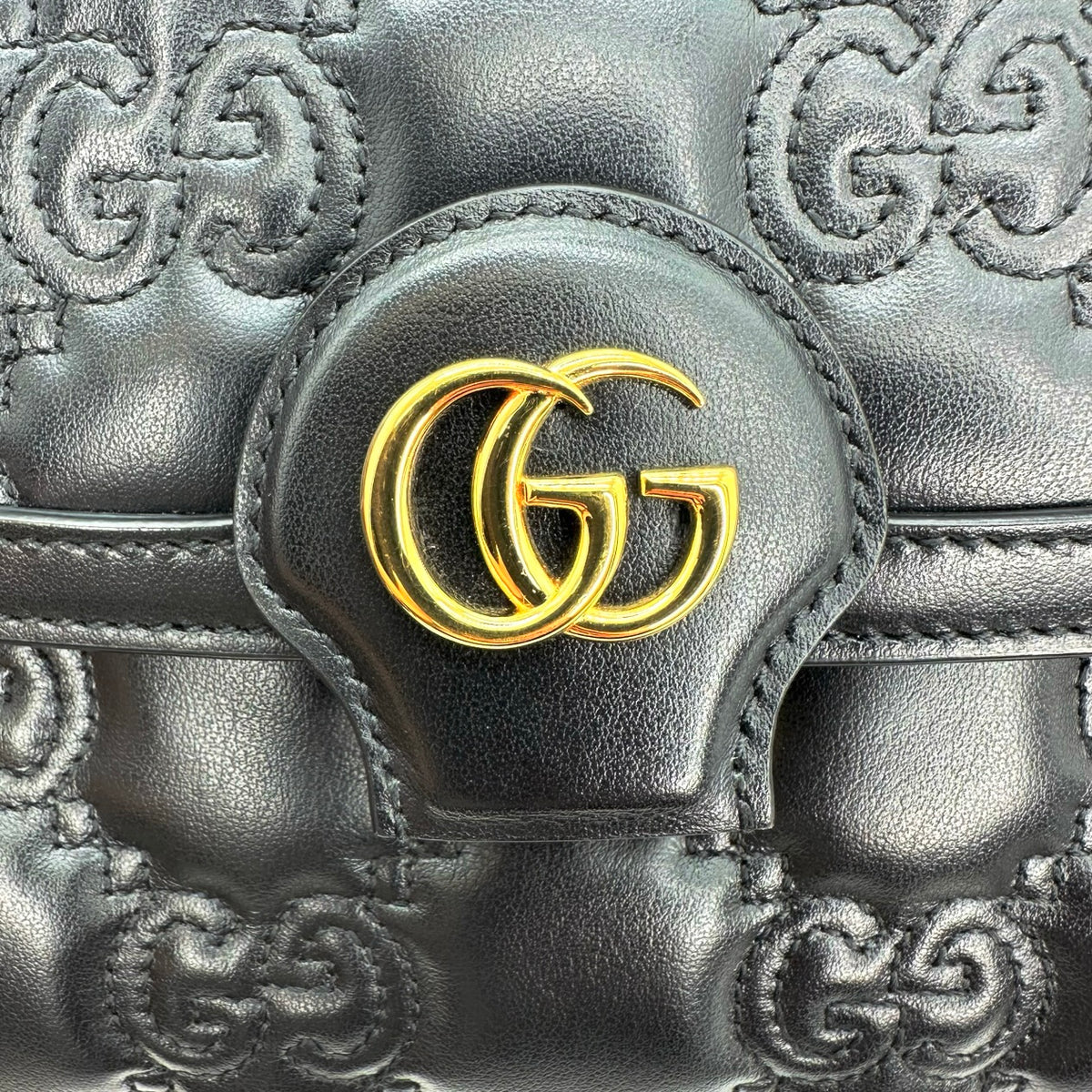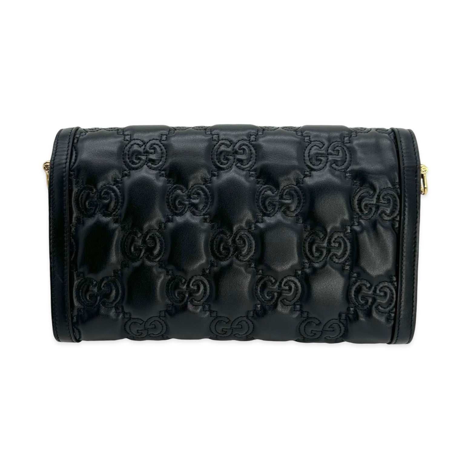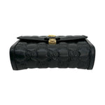 This is an authentic Gucci Small Flap Shoulder Bag crafted of Matelasse quilted GG calfskin leather in black with matching leather trim, cotton linen interior lining and gold-tone hardware. Exterior Features: flap closure, one (1) optional leather strap and one (1) optional adjustable canvas strap. Interior Features: separate compartment with one (1) center pocket.