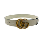 Unit price / perThis is an authentic Gucci GG Marmont Wide Belt crafted of smooth calfskin leather in Cream with antique gold-tone Double G buckle and matching leather trim. Size 80 (US 32).