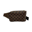 This is an authentic Louis Vuitton Geronimos sling bag crafted of Damier Ebene coated canvas with brown cowhide leather trim, textile interior lining and gold-tone hardware. Exterior Features: one (1) adjustable waist strap, one (1) snap coin pouch and one (1) velcro patch pocket at back. Interior Features: double zip closure.