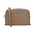 This is an authentic Prada Diagramme Camera Bag crafted of quilted calfskin leather in beige with matching leather trim, signature jacquard logo interior lining and silver-tone hardware. Exterior Features: zip top closure, adjustable chain and leather shoulder strap. Interior Features: one (1) zip pocket and one (1) flat pocket.