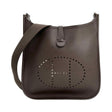 This is an authentic Hermes Evelyne 29 PM crafted of Epsom leather in Chocolat with woven canvas strap, matching suede interior and silver palladium hardware. Exterior Features: leather tab closure, snap closure, one (1) flat patch pocket at back, adjustable removable shoulder strap and front perforated Hermes H oval. Interior Features: one (1) open compartment.
