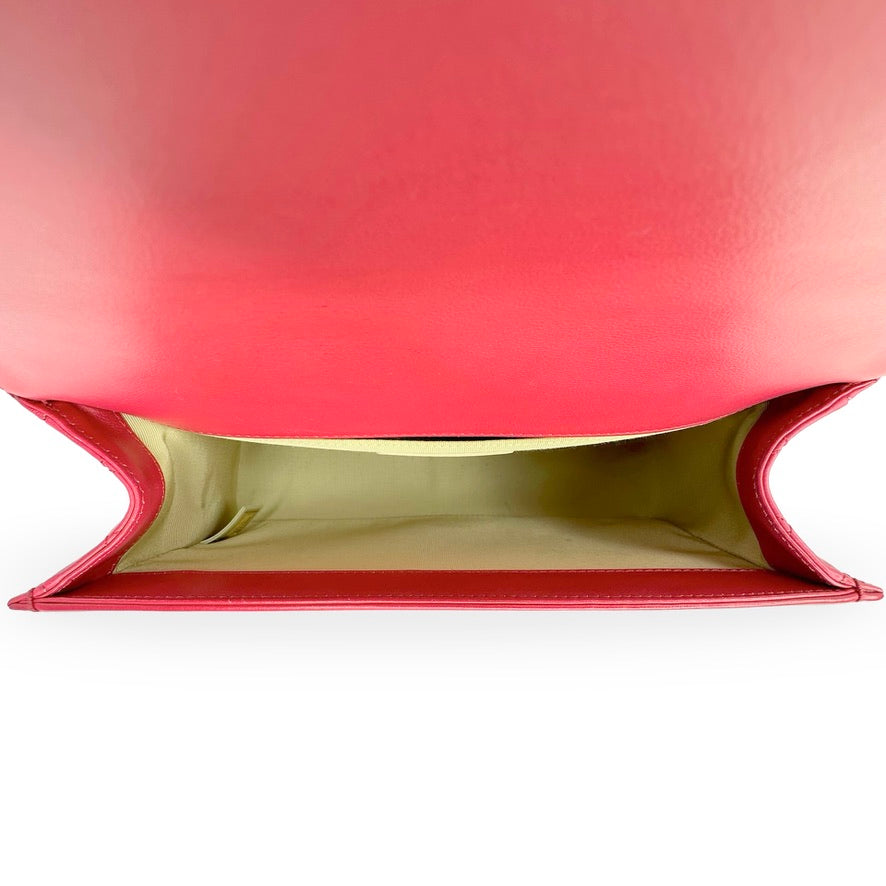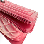 This is an authentic Chanel Old Medium Boy bag crafted of Mixed Quilted Chevron Lambskin leather in raspberry pink with gunmetal hardware, textile interior lining and matching leather trim. Exterior Features: fold over flap, adjustable sliding chain with leather shoulder pad and CC plaque push lock closure. Interior Features: one (1) patch pocket and open compartment.