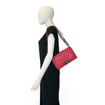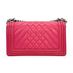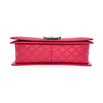 Unit price / perThis is an authentic Chanel Old Medium Boy bag crafted of Mixed Quilted Chevron Lambskin leather in raspberry pink with gunmetal hardware, textile interior lining and matching leather trim. Exterior Features: fold over flap, adjustable sliding chain with leather shoulder pad and CC plaque push lock closure. Interior Features: one (1) patch pocket and open compartment.