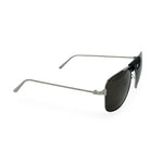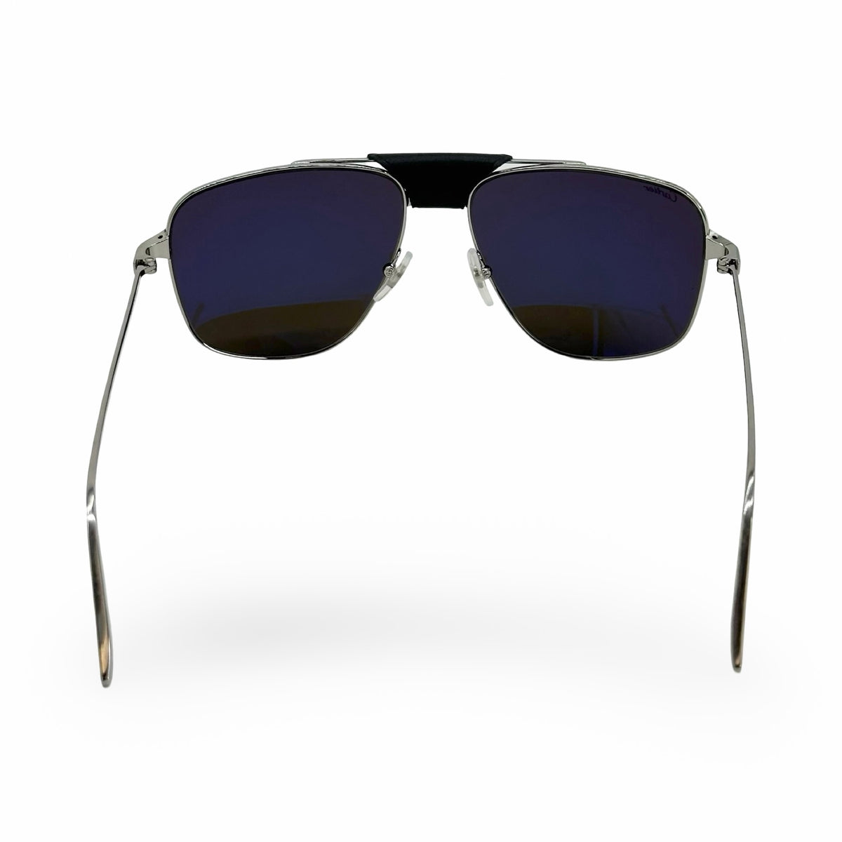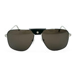 This is an authentic pair of Cartier Santos de Cartier Sunglasses featuring silver-tone metal frames, leather snap decoration at brow and solid dark lenses.