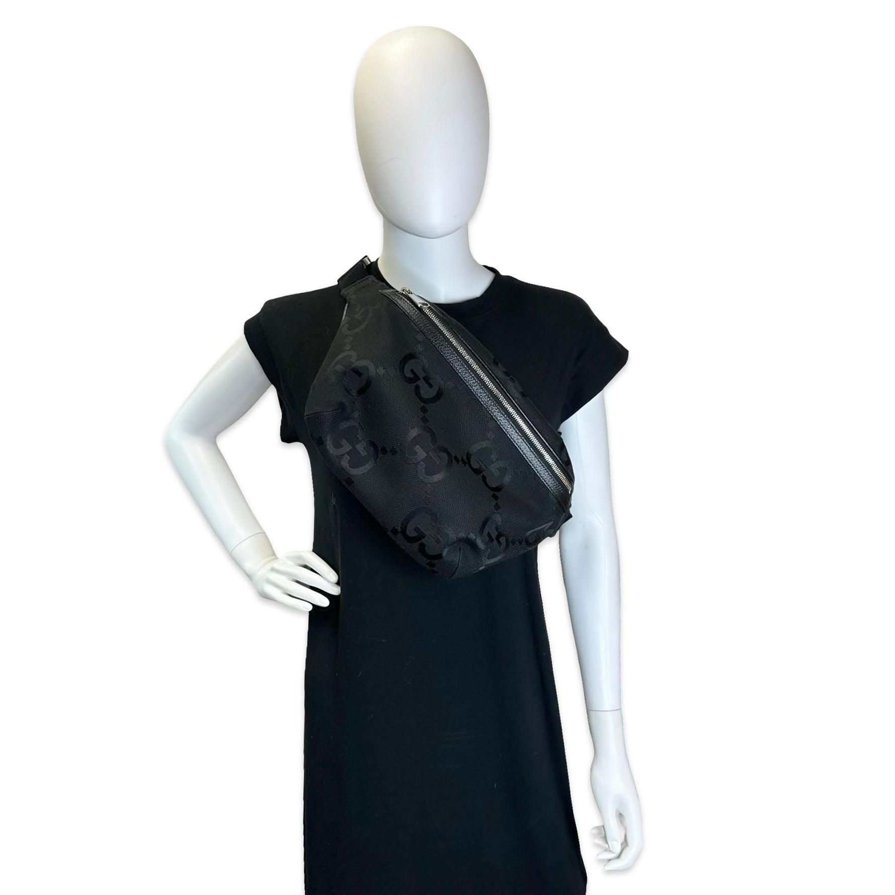 Unit price / perThis is an authentic Gucci Belt Bag crafted of Jumbo GG Canvas with black leather trim, cotton linen interior lining, woven strap with buckle closure and silver-tone hardware. Exterior Features: zip closure and adjustable woven canvas strap. Interior Features: open compartment.