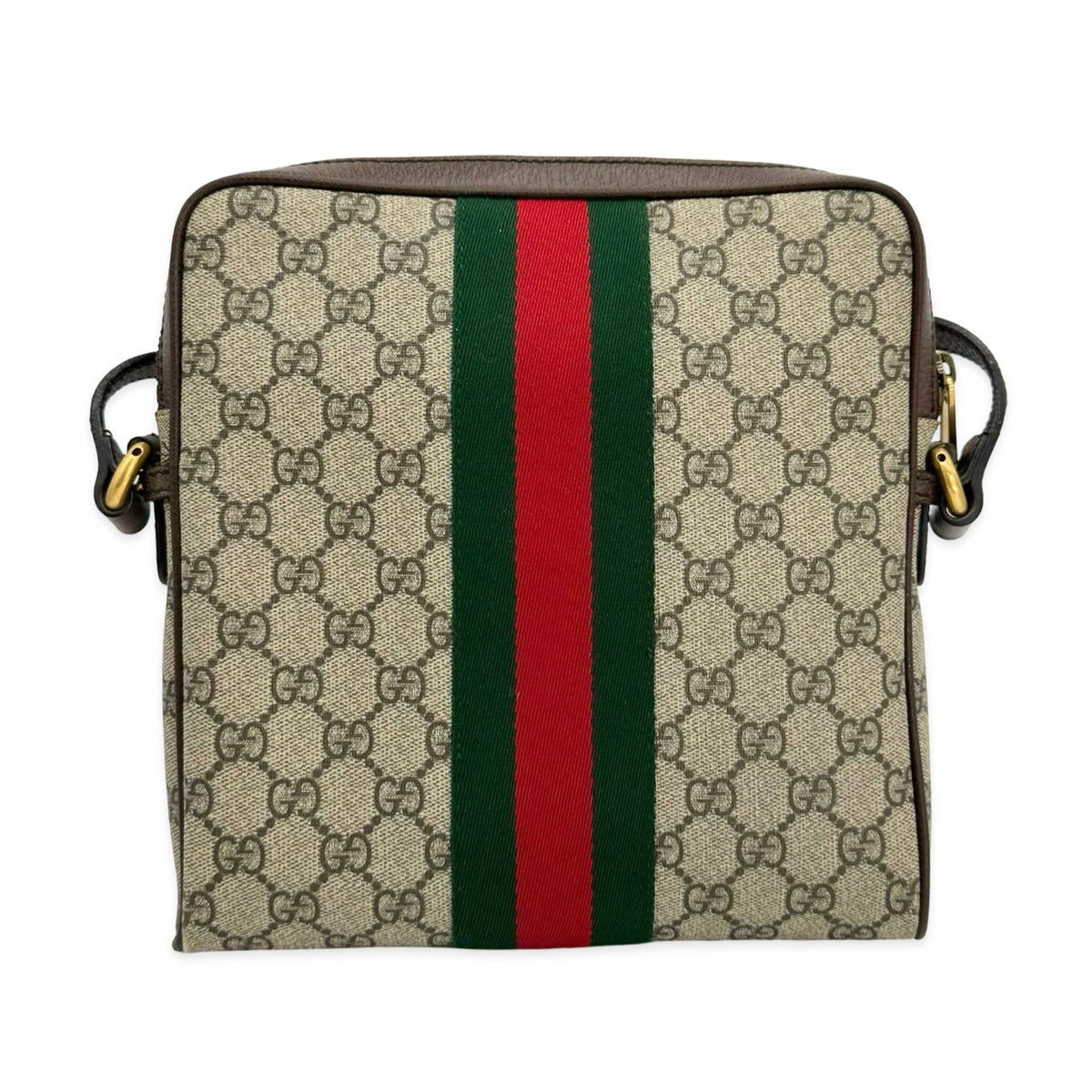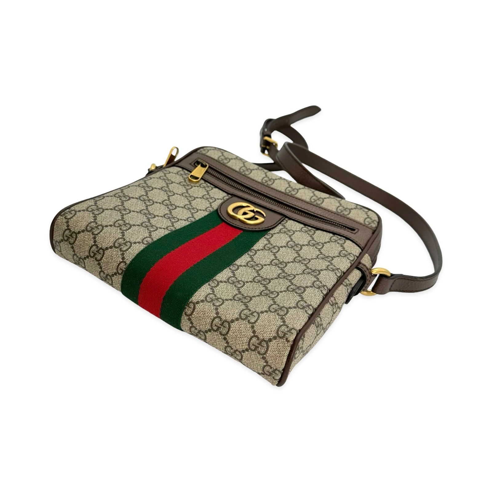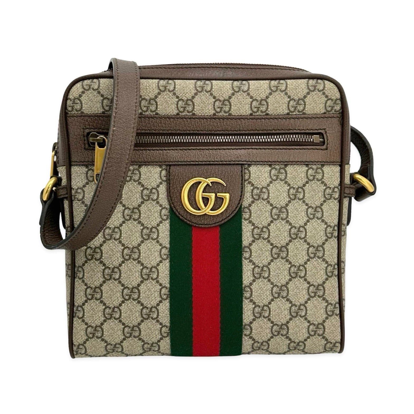 This is an authentic Gucci Ophidia Small Messenger Bag crafted of GG Supreme coated canvas with grained brown leather trim, beige cotton linen interior lining, and gold-tone hardware. Exterior Features: zip top closure, front zip flat pocket and one (1) adjustable leather shoulder strap. Interior Features: open compartment, one (1) zip pocket, and one (1) patch pocket.