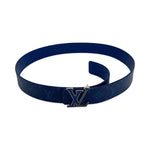 This is an authentic Louis Vuitton Reversible Belt crafted of Taiga Monogram leather in blue with matching leather trim and silver-tone buckle with enamel stripes. Size 100 (US 40).