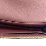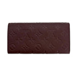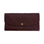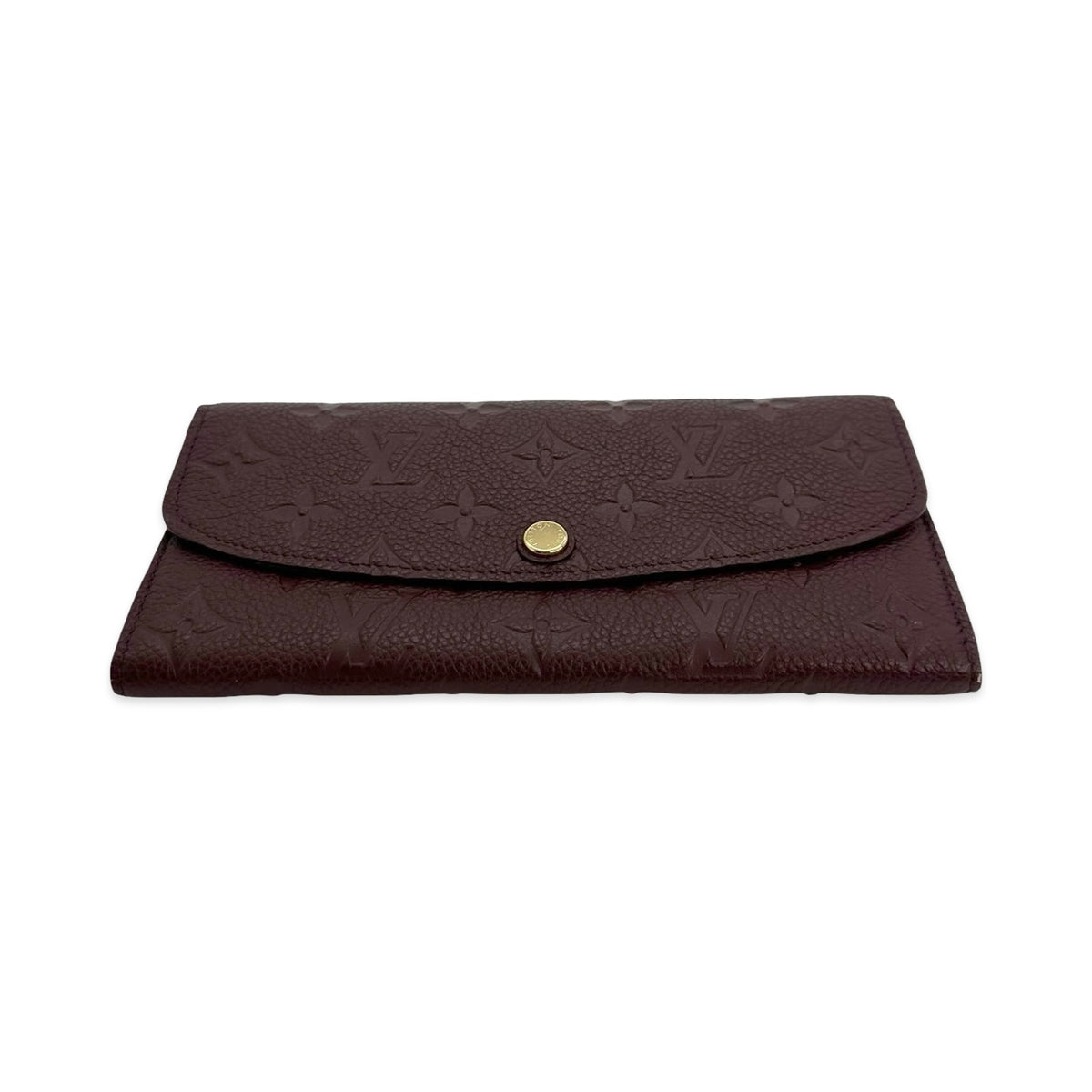 This is an authentic Louis Vuitton Emilie wallet crafted of Monogram Empreinte embossed supple grained cowhide leather in Wine red with matching grained cowhide interior and gold-tone hardware. Exterior Features: snap closure. Interior Features: two (2) slip pockets, one (1) zip pocket, and four (4) card slots.