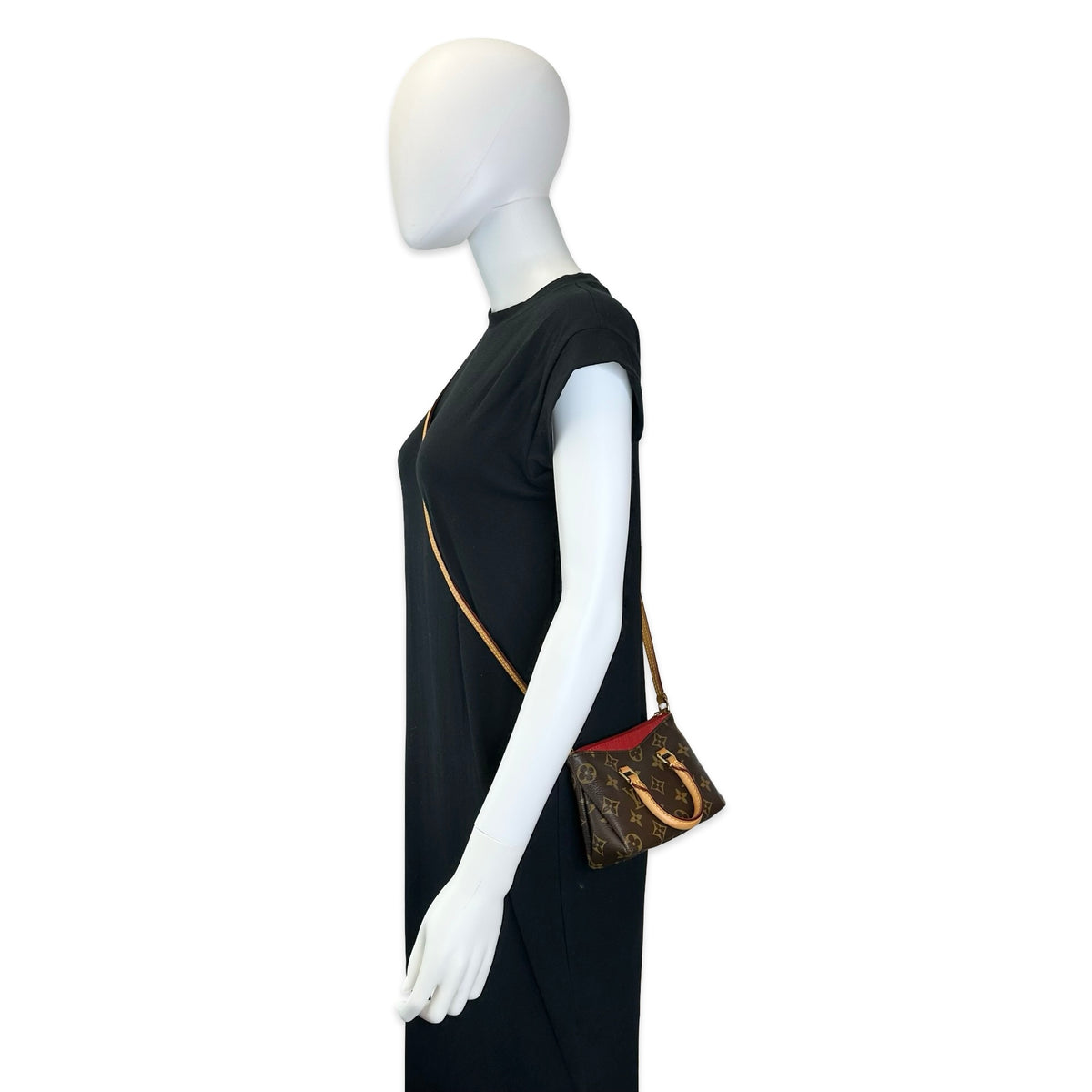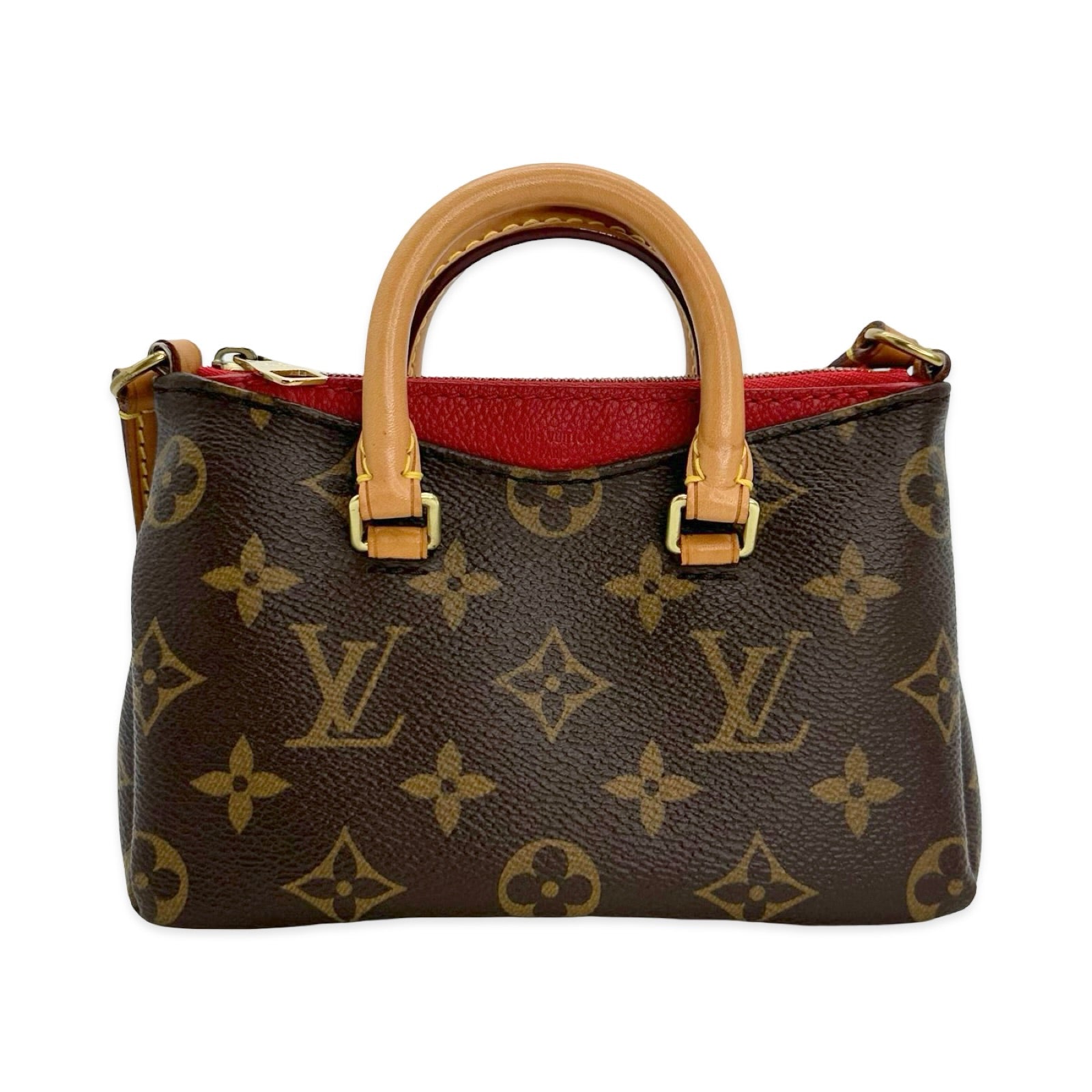 Unit price / perThis is an authentic Louis Vuitton Nano Pallas crafted of Monogram canvas with red grained leather accents, natural cowhide leather trim, red textile interior lining and gold-tone hardware. Exterior Features: zip closure, one (2) shoulder strap and one (1) patch pocket at front. Interior Features: open compartment.