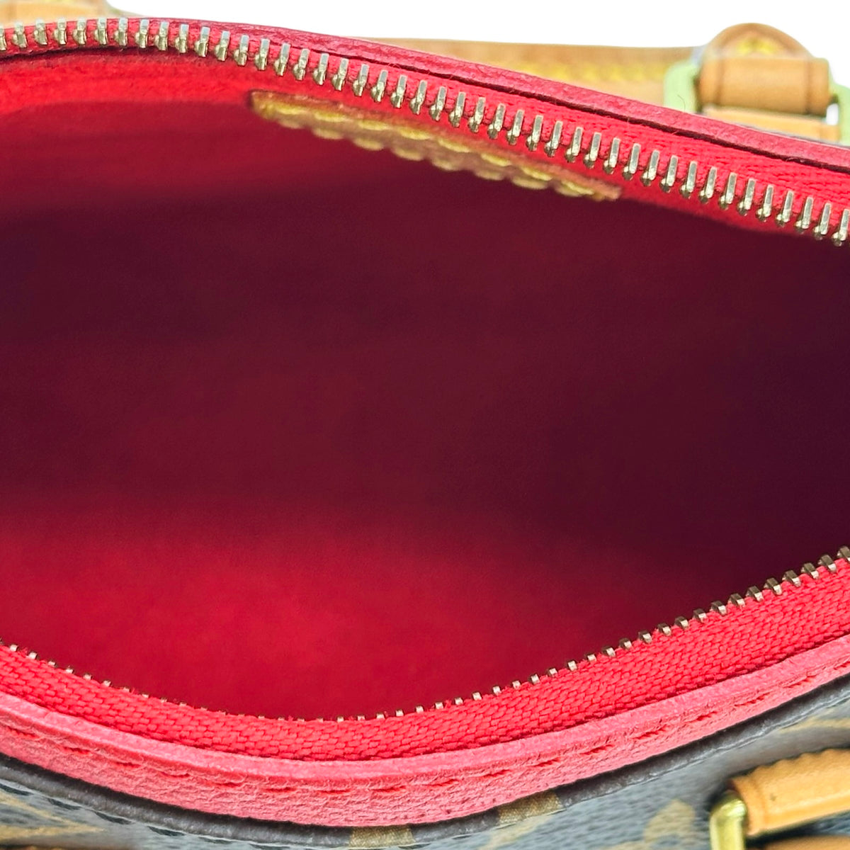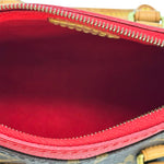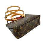 This is an authentic Louis Vuitton Nano Pallas crafted of Monogram canvas with red grained leather accents, natural cowhide leather trim, red textile interior lining and gold-tone hardware. Exterior Features: zip closure, one (2) shoulder strap and one (1) patch pocket at front. Interior Features: open compartment.