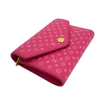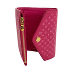 This is an authentic Louis Vuitton Victorine Wallet crafted of Micro Monogram Embossed calfskin leather in pink with matching leather interior and gold-tone hardware. Exterior Features: snap closure. Interior Features: six (6) card slots, two (2) additional pockets, one (1) billfold and one (1) zip pocket.