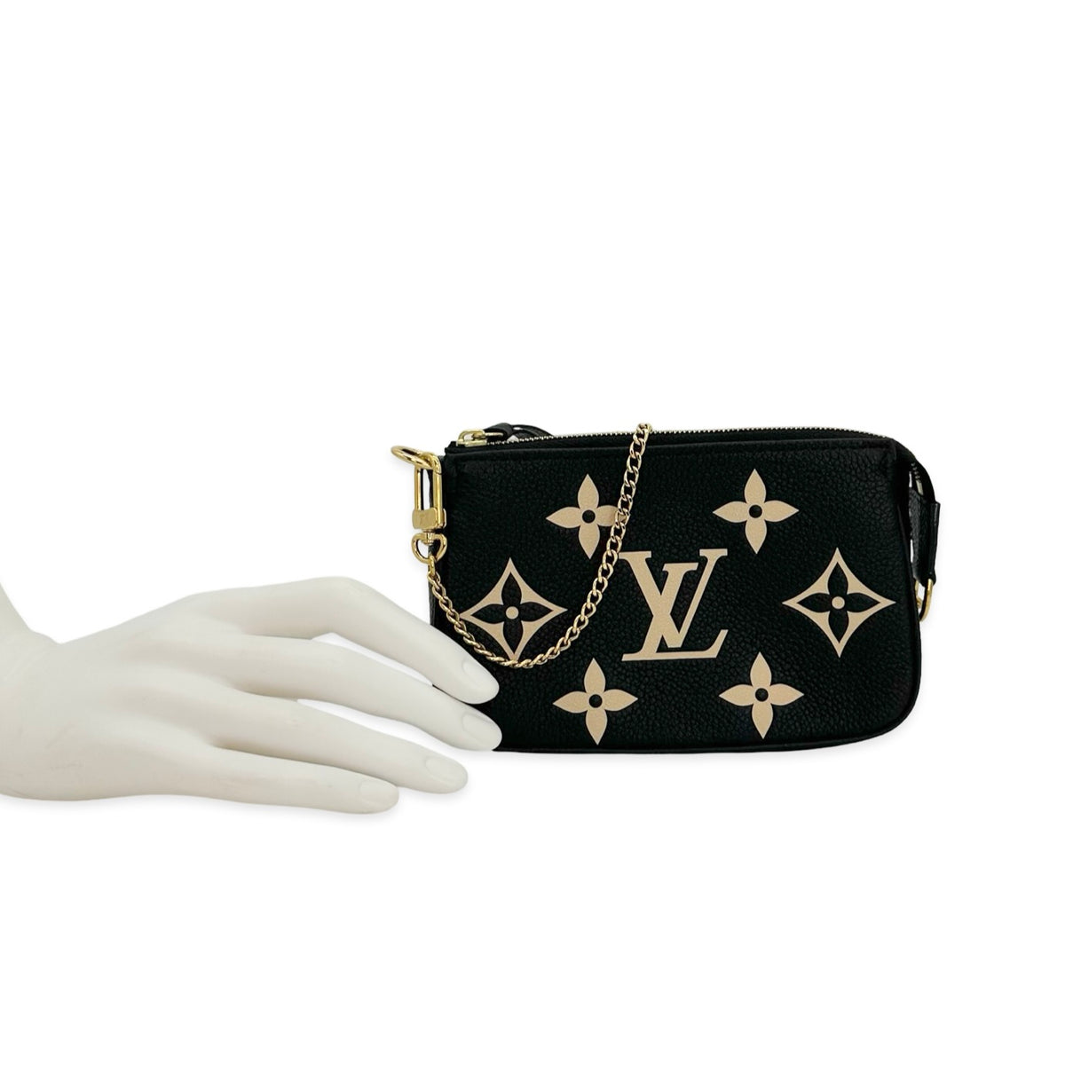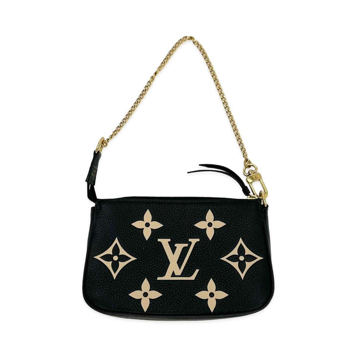 This is an authentic Louis Vuitton Mini Pochette Accessoires crafted of Bicolor Monogram Empreinte embossed grained cowhide leather in Black/Cream with black microfiber interior lining and gold-tone hardware. Exterior Features: zip closure and chain strap. Interior Features: open compartment.