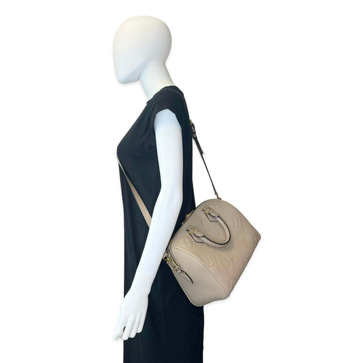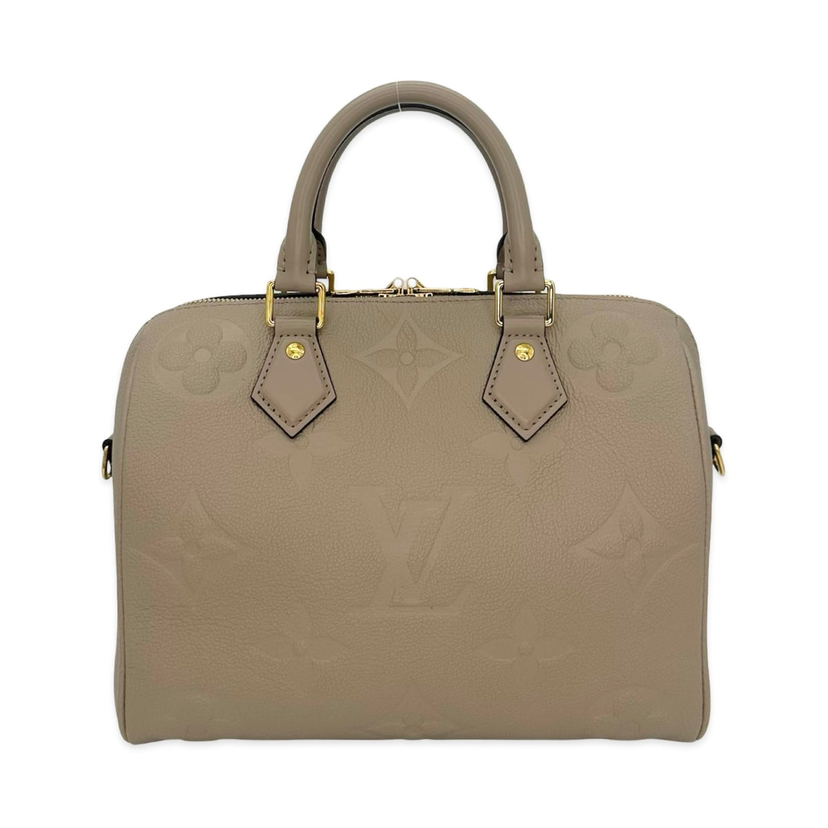 Unit price / perThis is an authentic Louis Vuitton Speedy Bandouliere 25 crafted of Monogram Empreinte leather in Turtledove with matching smooth cowhide leather trim, tonal microfiber interior lining and gold-tone hardware. Exterior Features: double zip closure, two (2) leather top handles and removable/adjustable shoulder strap. Interior Features: open compartment and one (1) flat pocket.