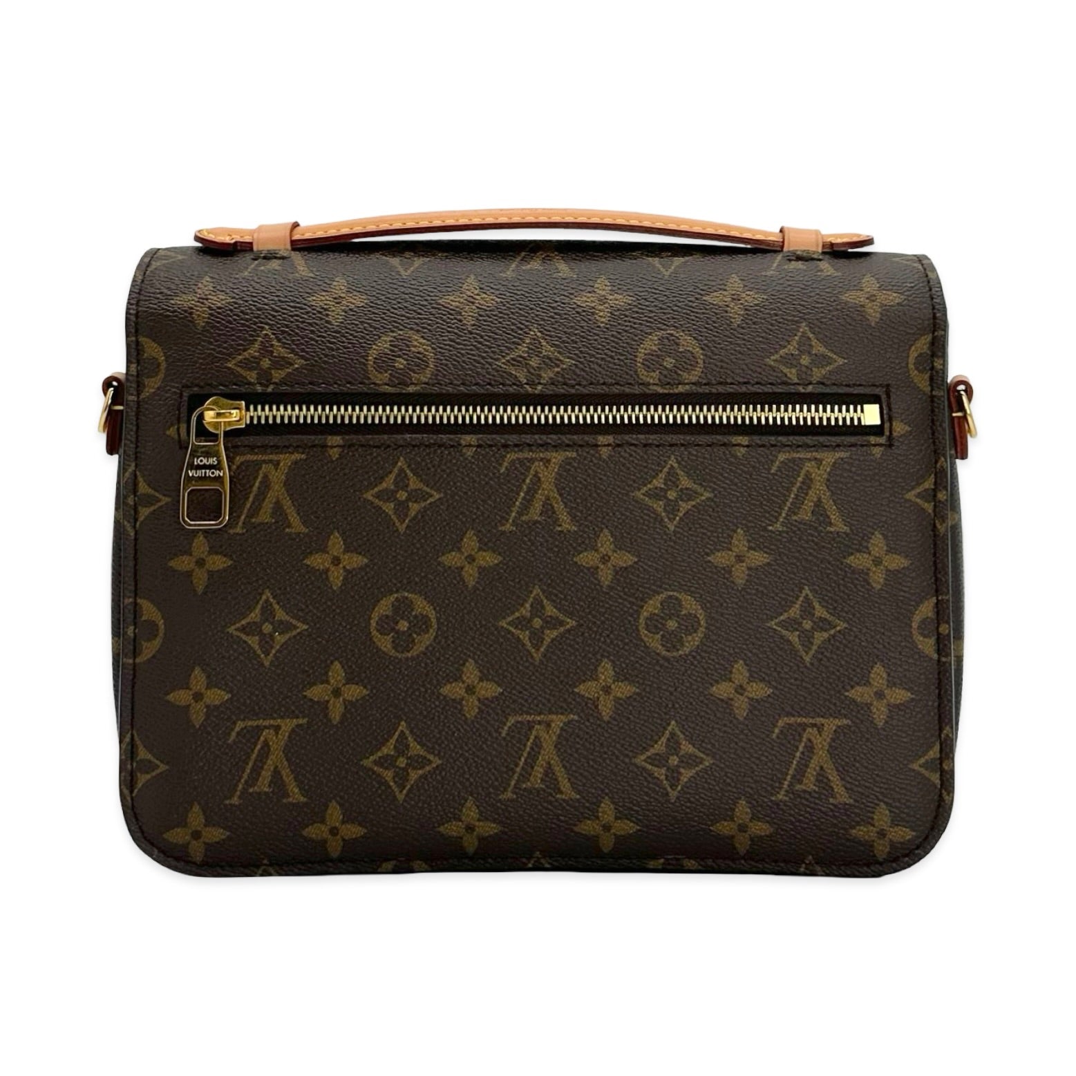 Unit price / perThis is an authentic Louis Vuitton Pochette Metis crafted of Monogram coated canvas with cowhide leather trim, microfiber textile interior lining and gold-tone hardware. Exterior Features: S-lock closure, one (1) leather top handle, one (1) back zip pocket and optional adjustable shoulder strap. Interior Features: three (3) partitioned interior compartments.