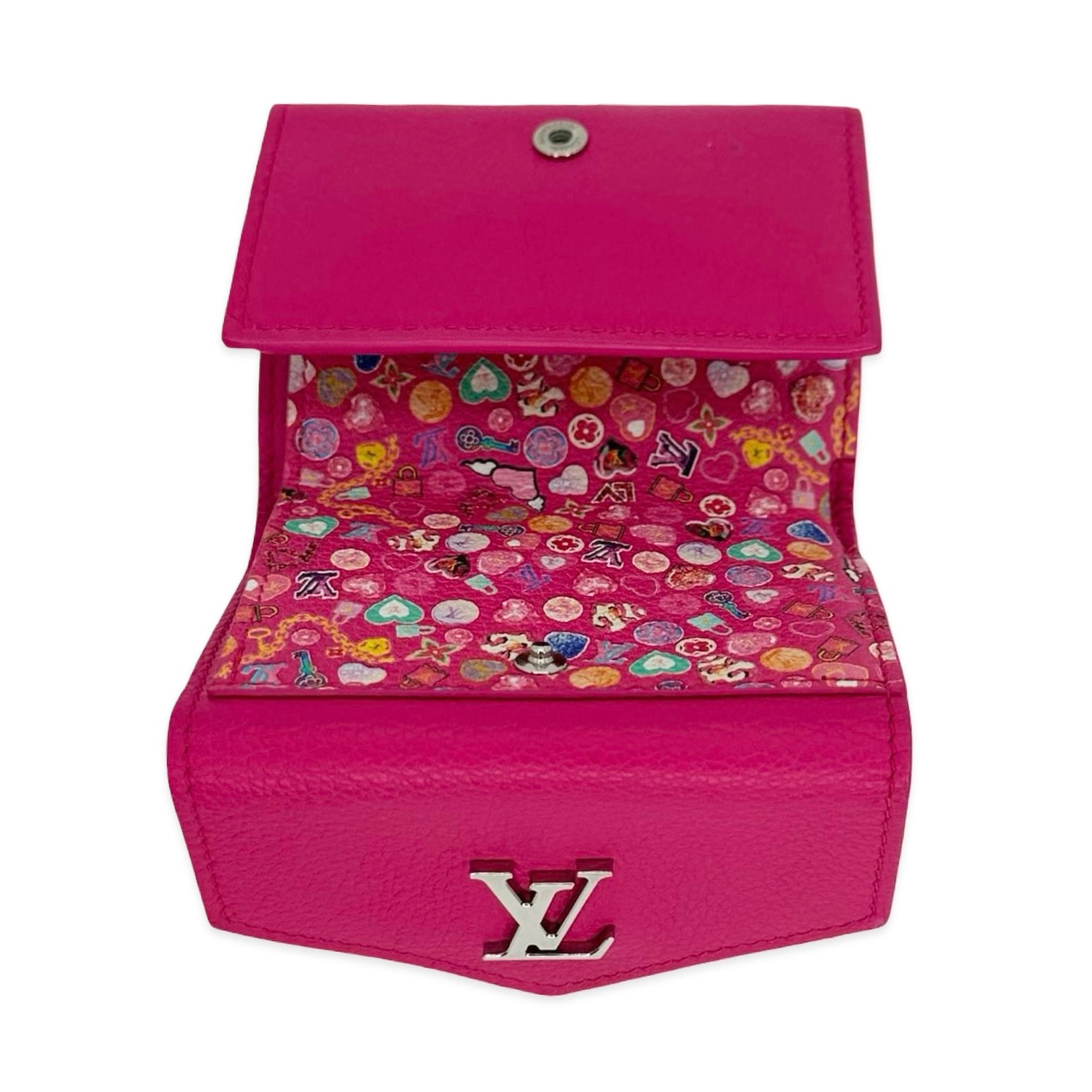 Unit price / perThis is an authentic Louis Vuitton Portefeuille Rock Mini Wallet crafted of Monogram Embossed smooth caflskin leather in pink with matching leather interior, printed gemstone motif lining and gold-tone hardware. Exterior Features: snap closure. Interior Features: six (6) card slots, two (2) additional pockets, one (1) billfold and one (1) zip pocket.