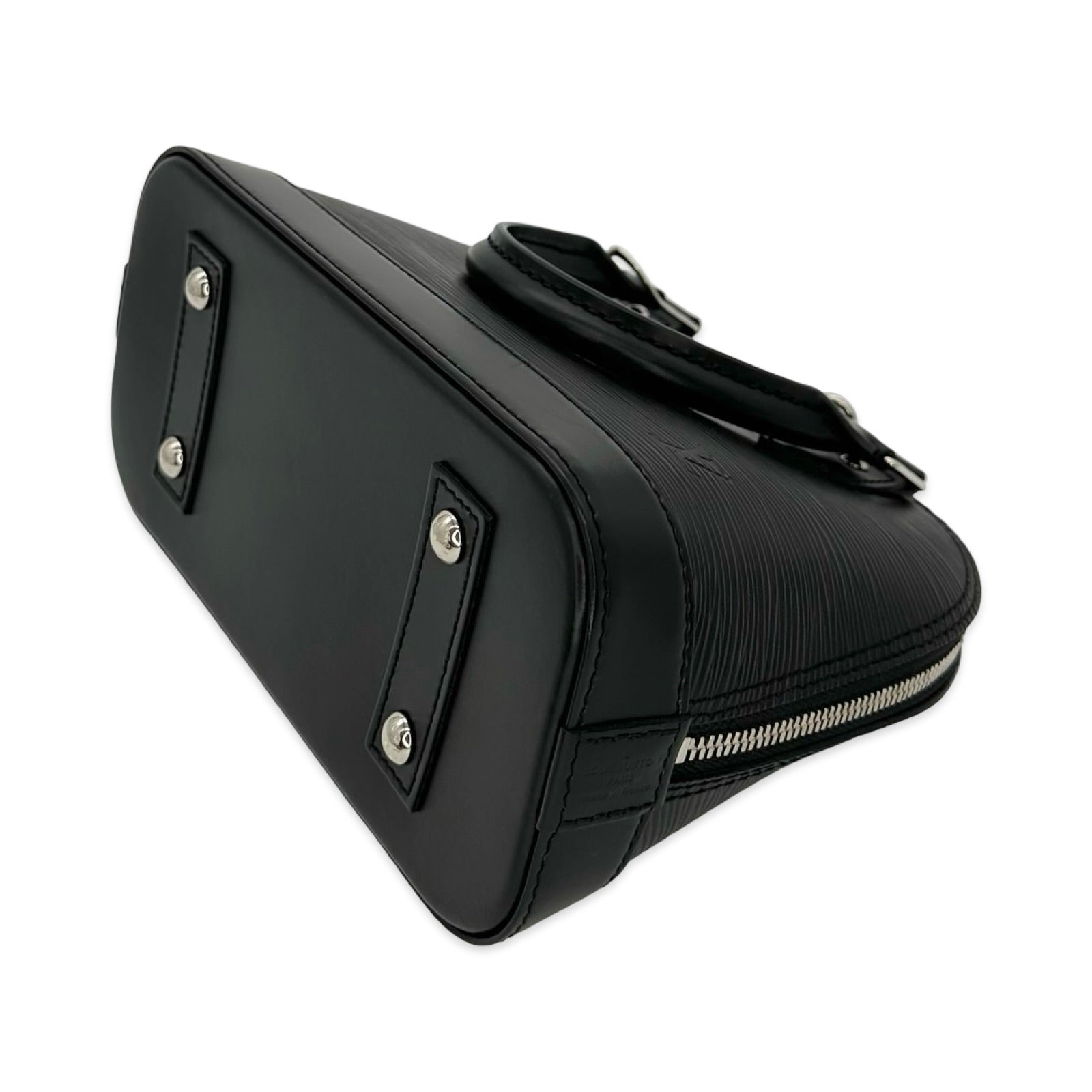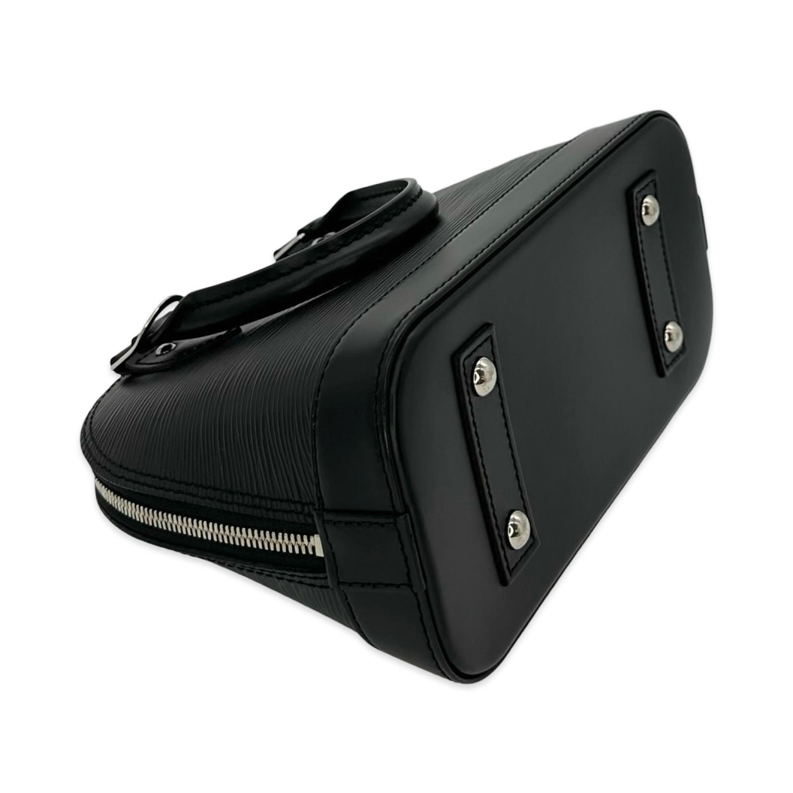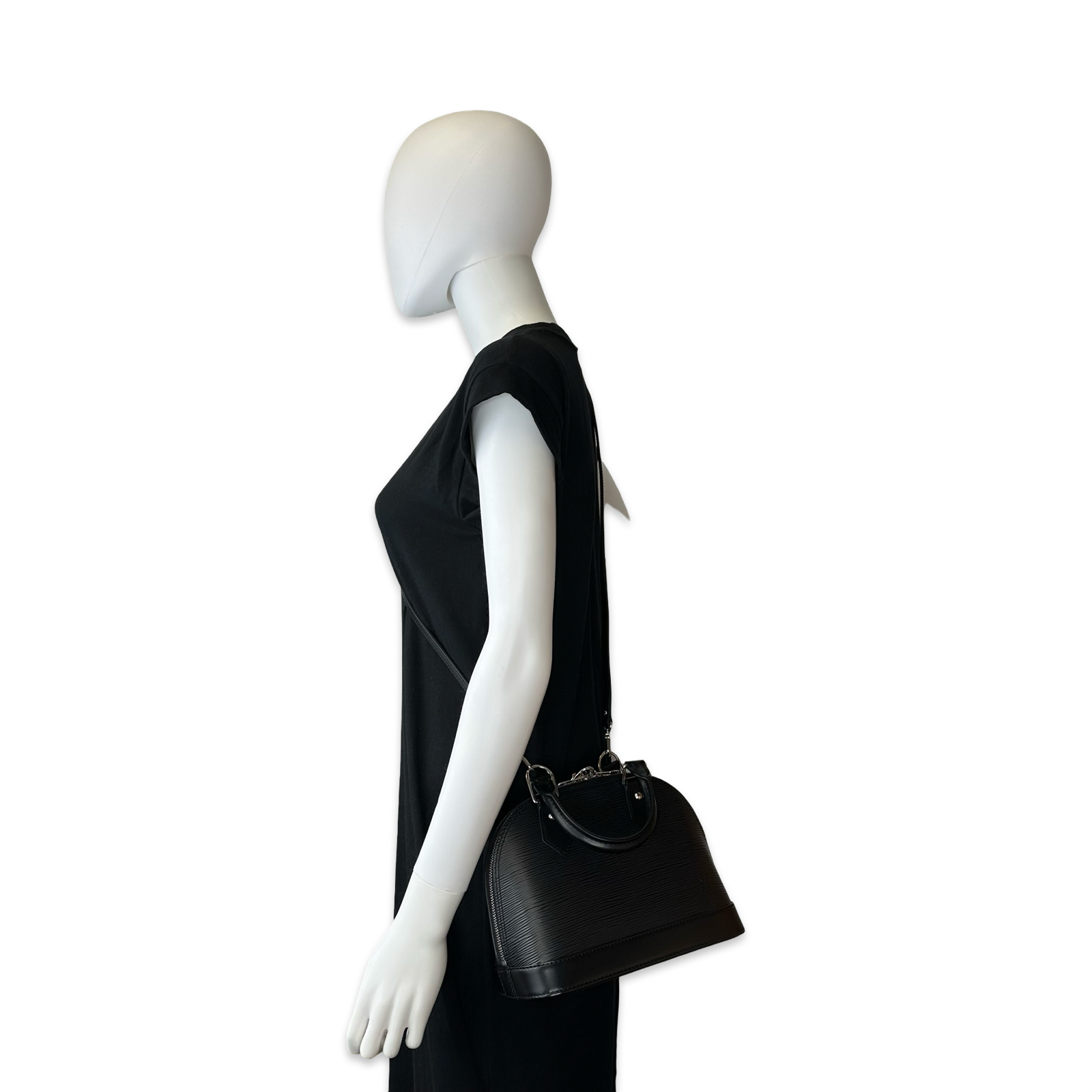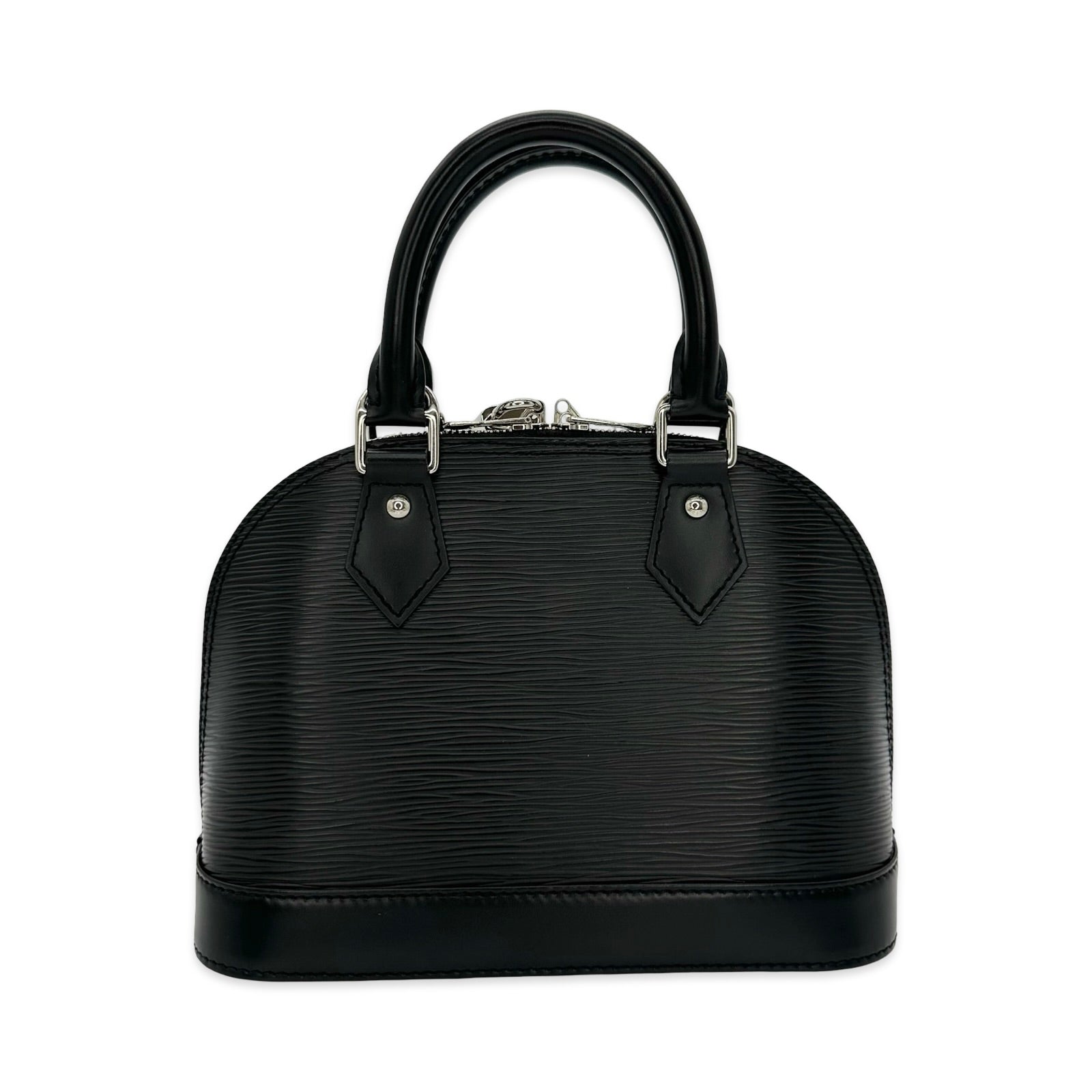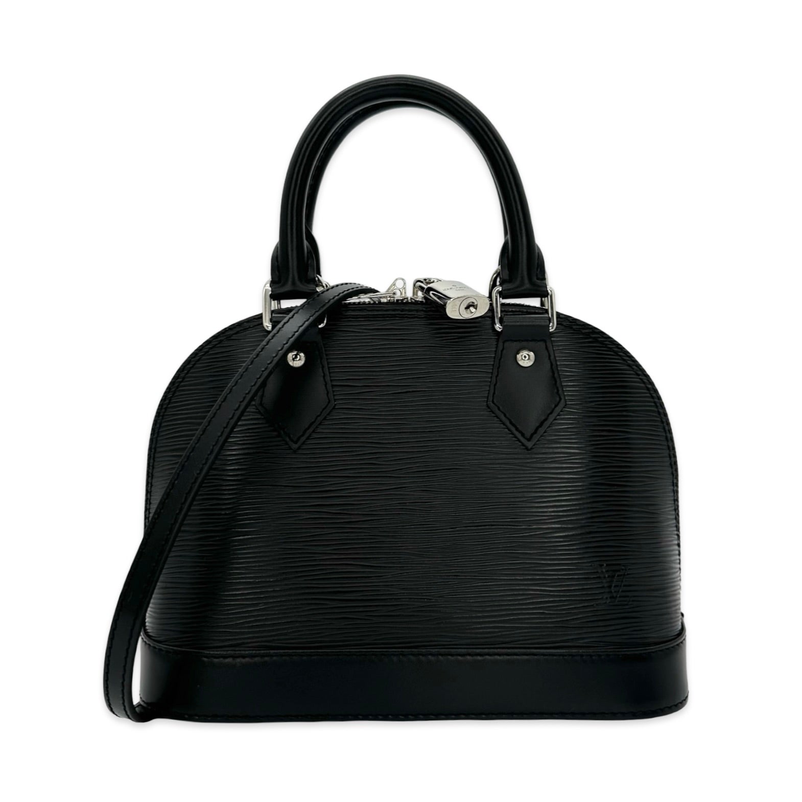 Unit price / perThis is an authentic Louis Vuitton Alma BB crafted of Epi leather in Black with matching leather trim, grey microfiber interior lining and silver-tone hardware. Exterior Features: double zip closure, two (2) leather top handles, one (1) optional leather shoulder strap and four (4) protective leg studs. Interior Features: open compartment and one (1) flat pocket.